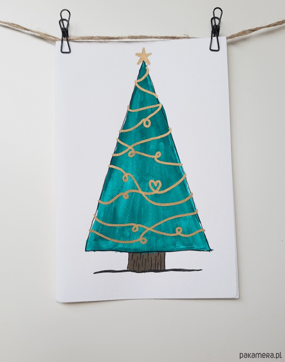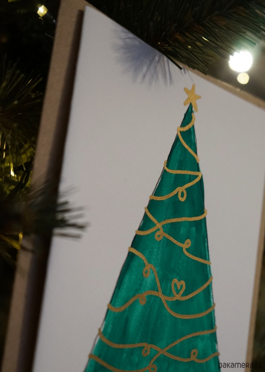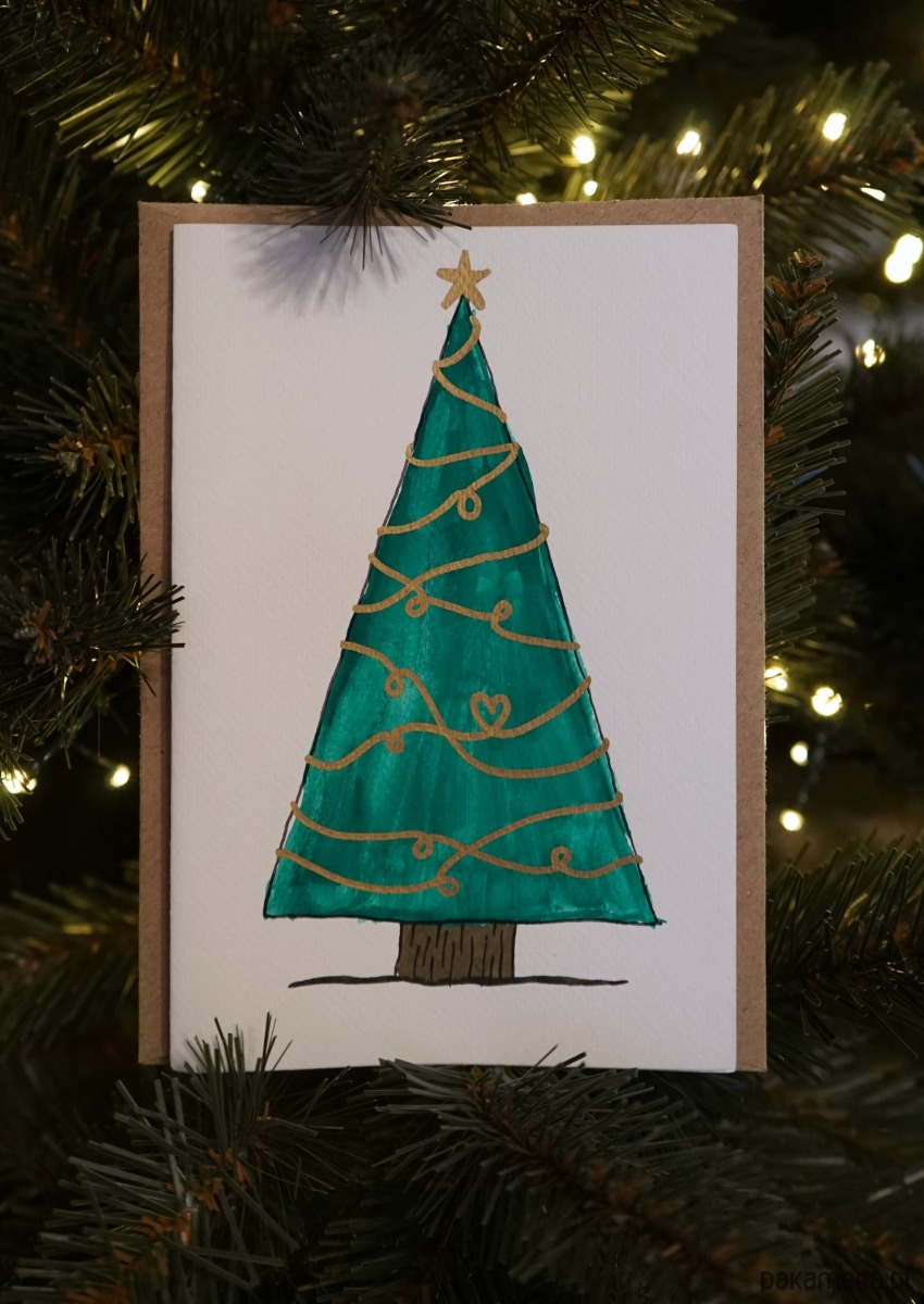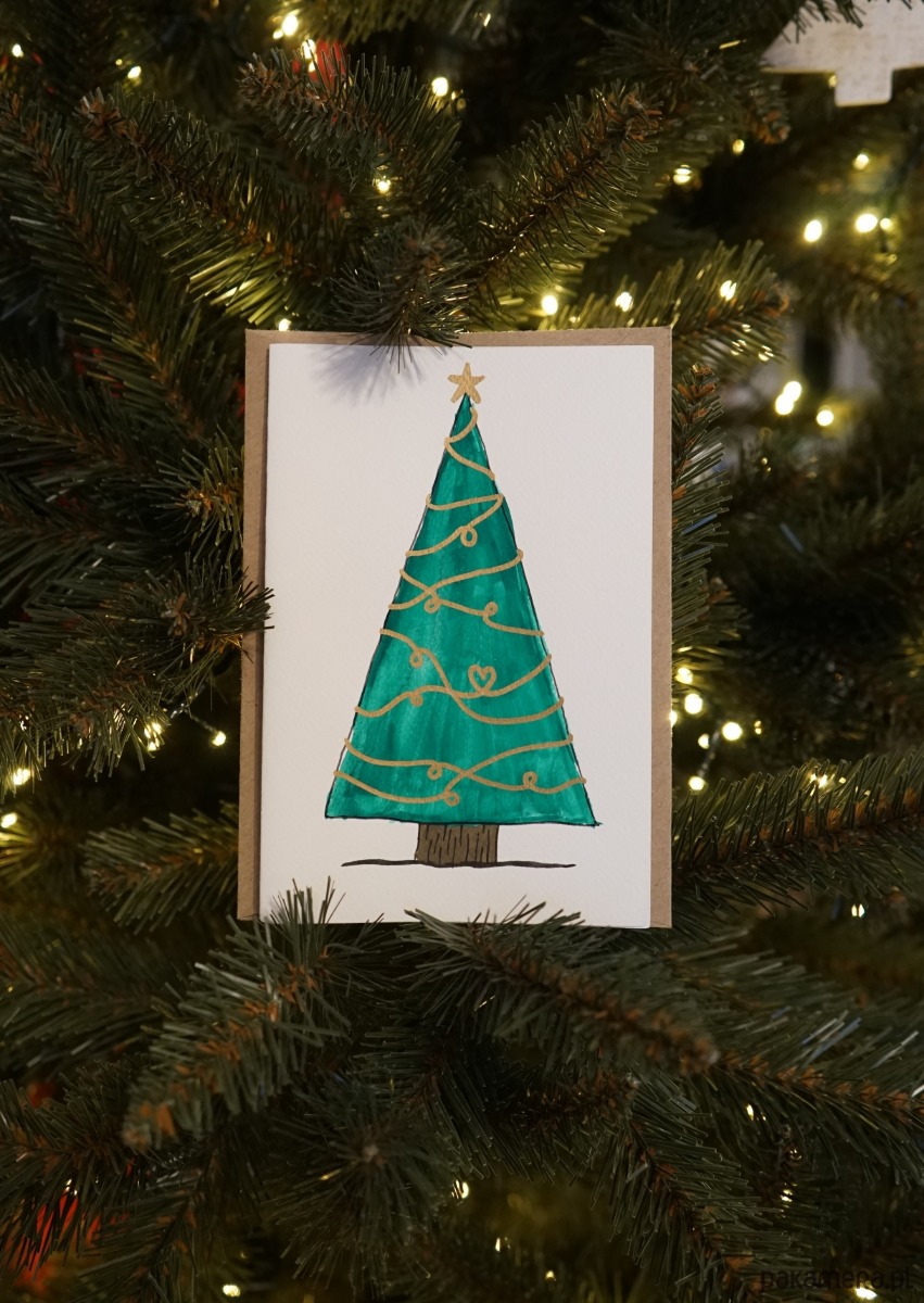 Ręcznie malowana kartka świąteczna z motywem choinki ze złotym łańcuchem.
