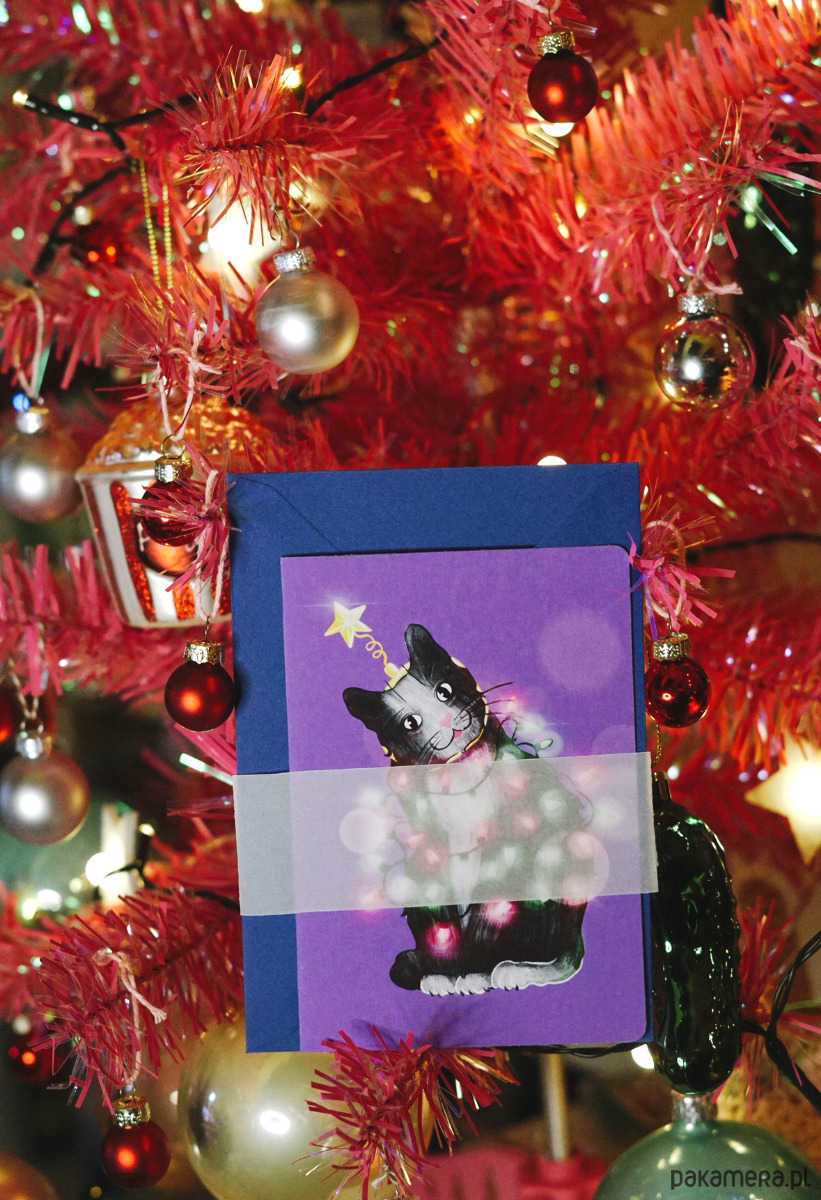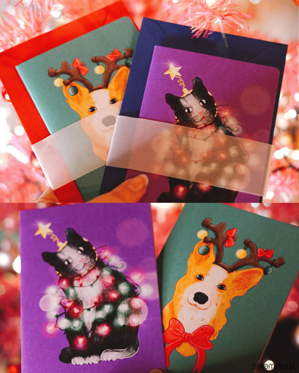 Kartki świąteczne w dwóch wariantach razem z dedykowanymi kopertami. Rysowane i drukowane w Polsce.