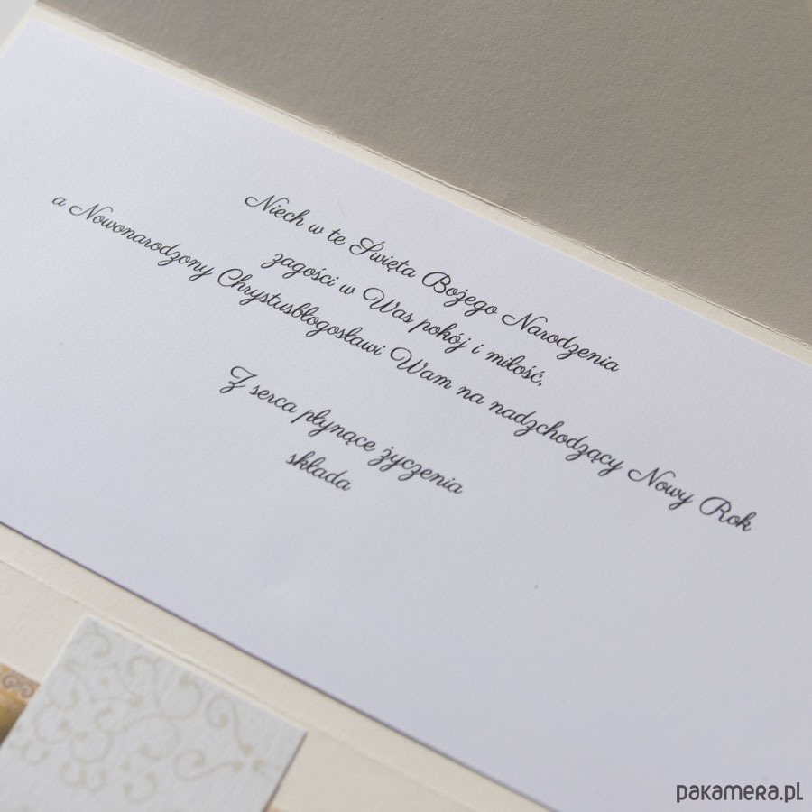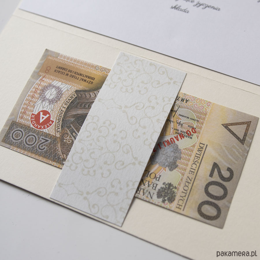 Kartka ma formę rozkładanego folderu, w środku znajduje się miejsce na życzenia oraz miejsce na pieniądze (kieszonka z wzorzystego papieru na jednym ze skrzydełek kartki).