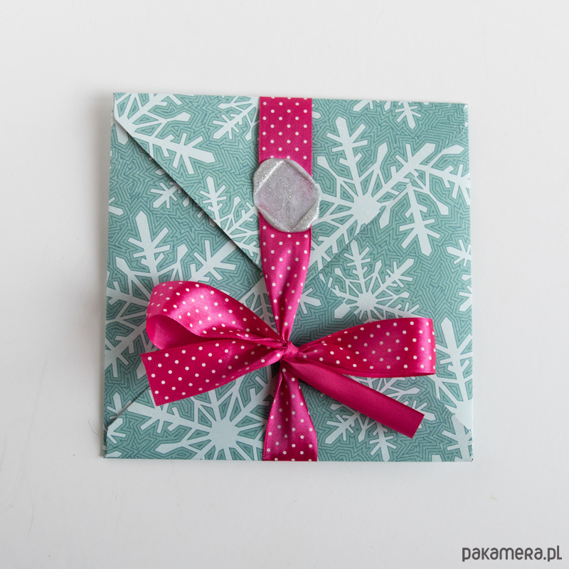 Ręcznie robiona koperta, przewiązana wstążką, po rozwiązaniu otwiera się tworząc dużą kartę z miejscem na pieniądze (ozdobna kieszonka na lewym skrzydełku kartki pozwala na wsunięcie poskładanych banknotów).