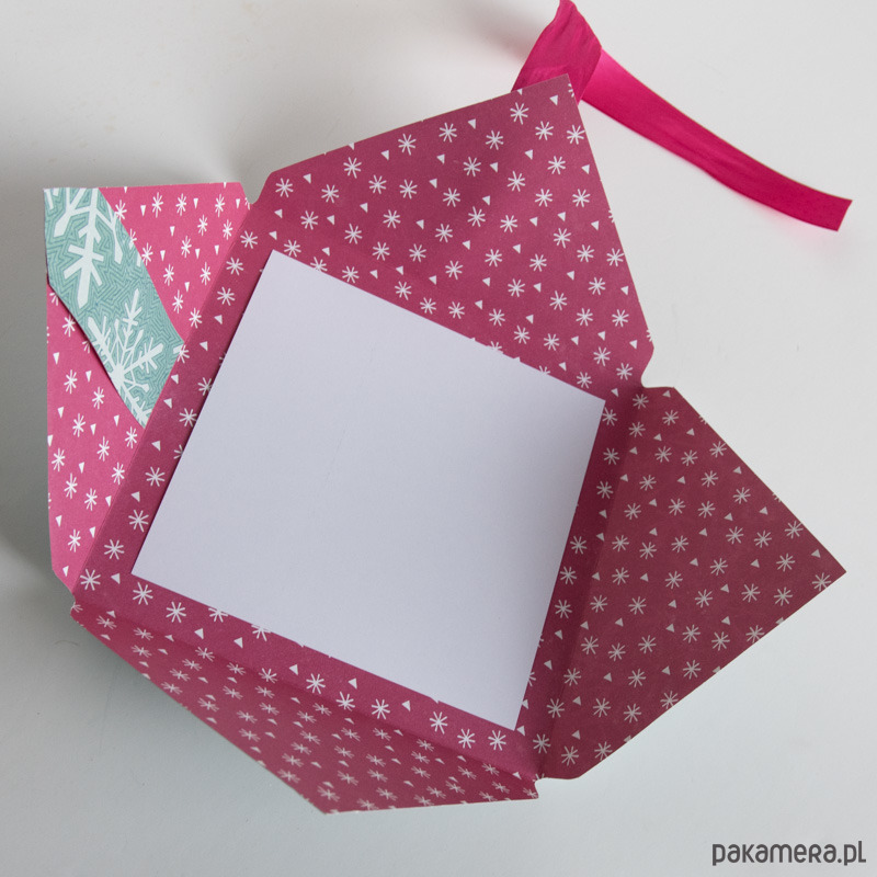 Koperta po złożeniu ma wymiary ok. 17,5x17,5cm, więc jest sporo większa niż standardowe kartki z życzeniami.