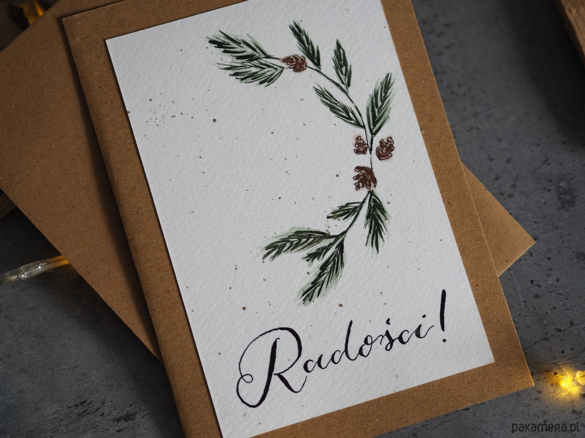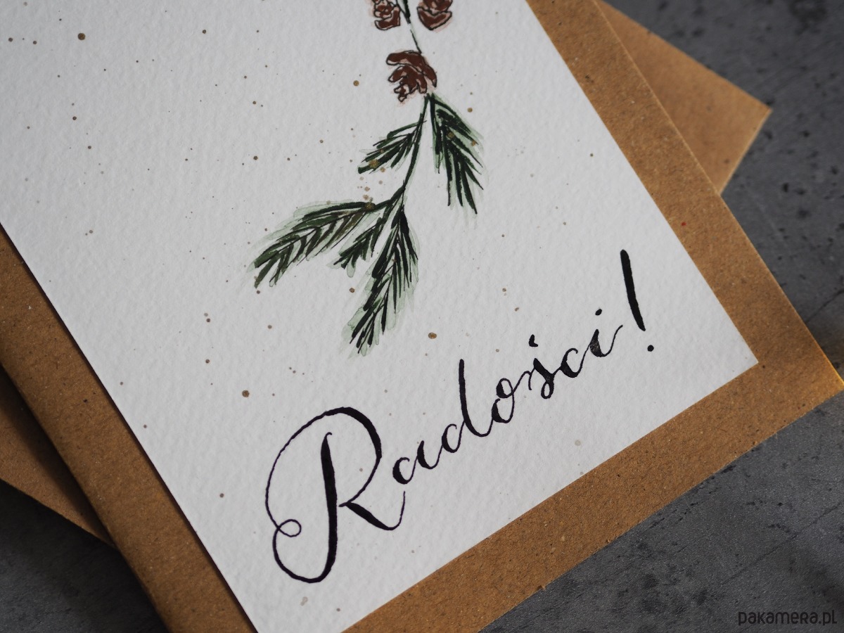 Kartka zawiera ilustrację malowaną akwarelami oraz ręcznie kaligrafowany napis. Wykorzystano fakturowany papier wysokiej jakości. Kartka oraz koperta wykonane są z papieru ekologicznego.
