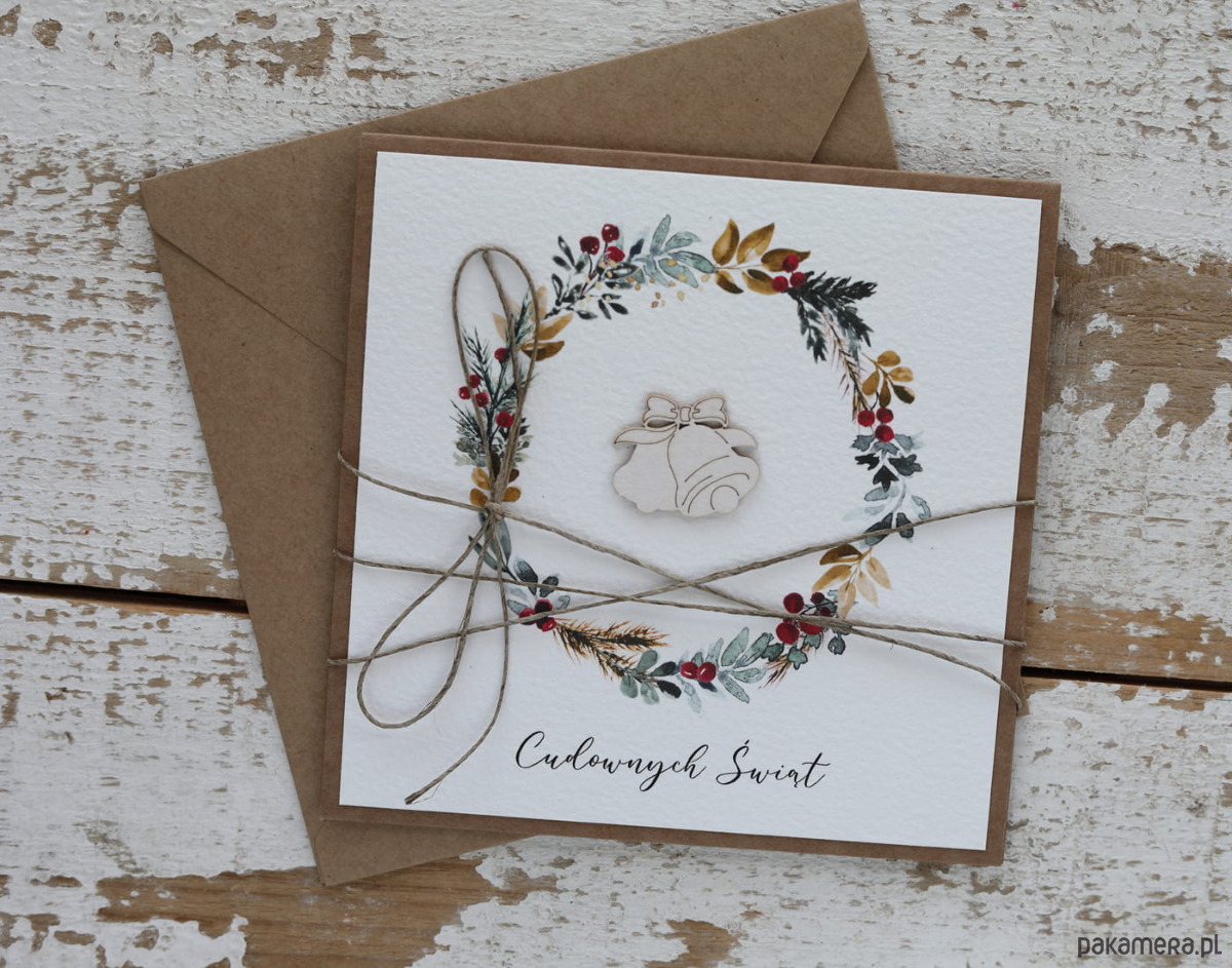 Wymiary: kartka 14x14cm otwierana do góry, przewiązana lnianym sznureczkiem w zestawie z brązową kopertą.