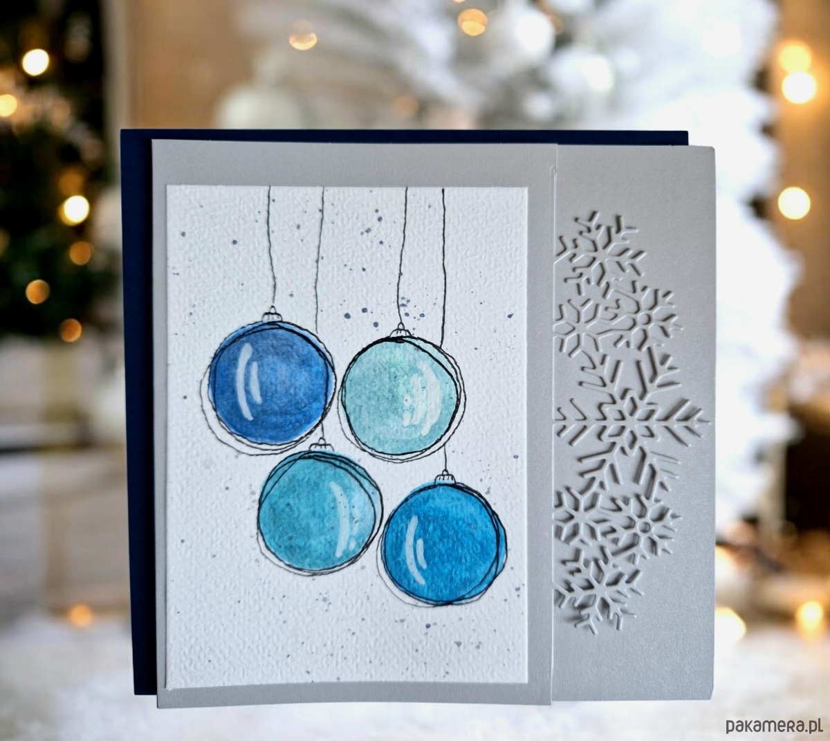 Elegancka kartka świąteczna utrzymana w zimowej kolorystyce błękitu i srebra. Na okładce widnieją ręcznie malowane akwarelami bombki, delikatnie rozmyte, tworząc subtelny, artystyczny efekt.