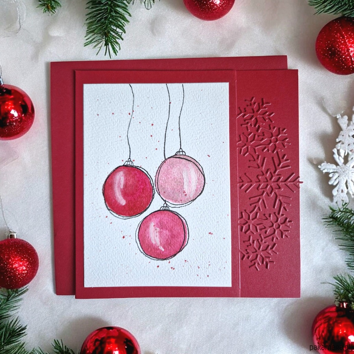 Elegancka kartka świąteczna utrzymana w świątecznej kolorystyce czerwieni. Na okładce widnieją ręcznie malowane akwarelami bombki, delikatnie rozmyte, tworząc subtelny, artystyczny efekt. Ręcznie wycięta śnieżynka symbolizuje zimową magię i unikalny, rzemieślniczy charakter pracy.