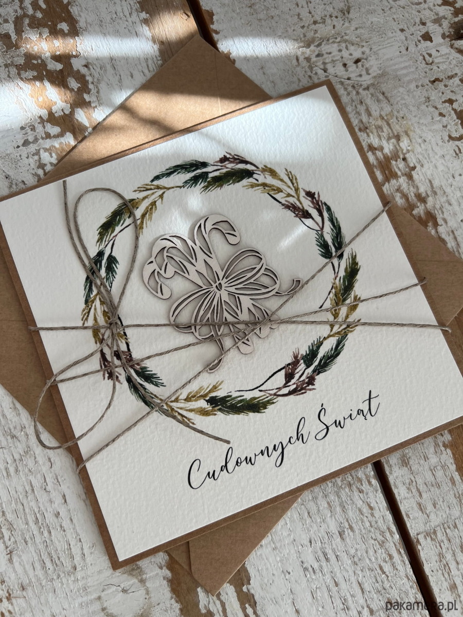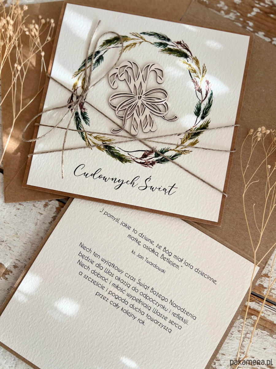 Kartka eko na Boże Narodzenie o wymiarach 14x14 cm wykonana ze starannie dobranych najwyższej jakości papierów i dodatków w tym papieru kraftowego, papieru bawełnianego 100% bawełny w odcieniu śmietanki, tekturowej ozdoby oraz lnianego sznureczka. W środku kartka ma już gotowe życzenia widoczne na zdjęciu.