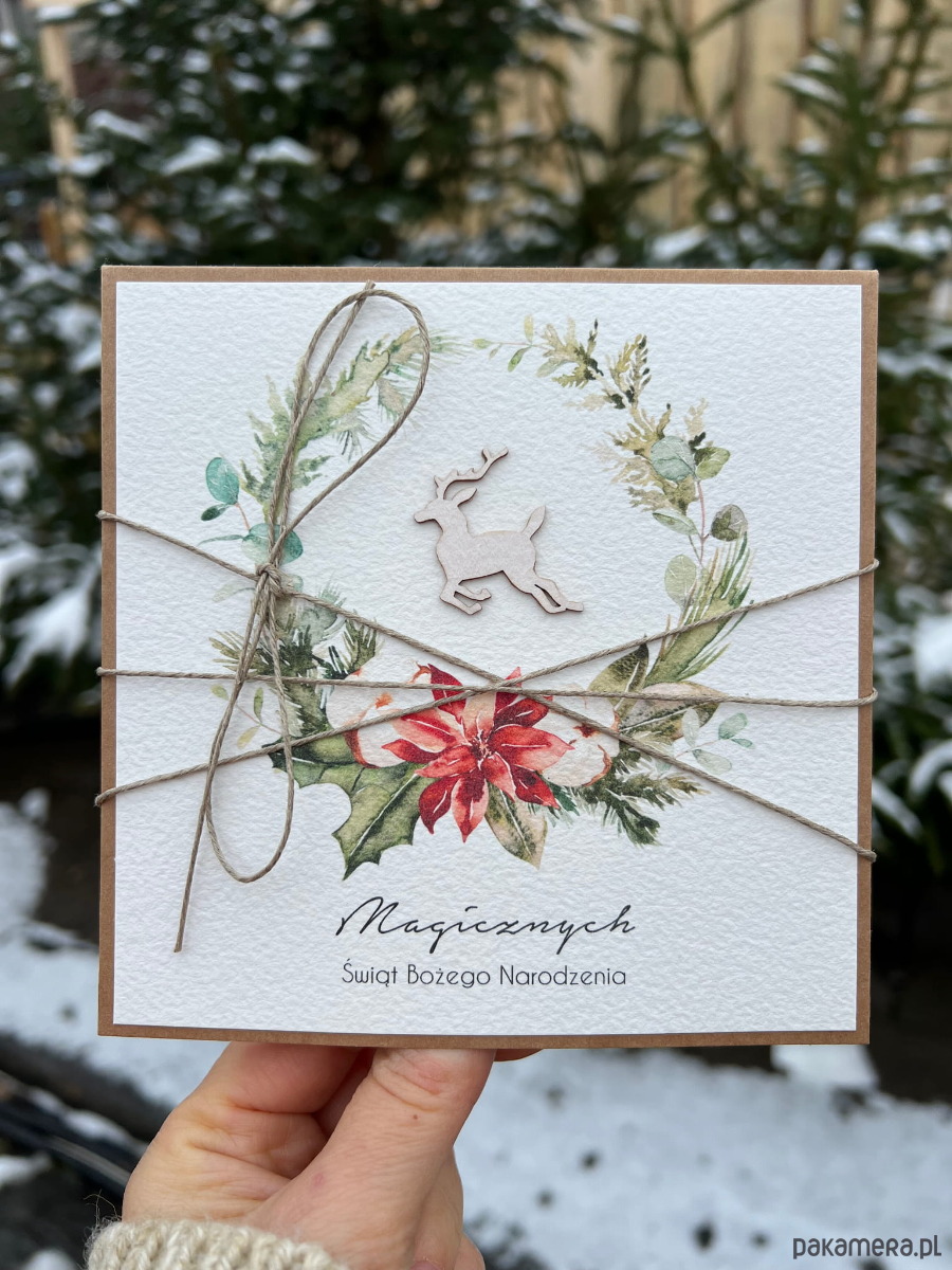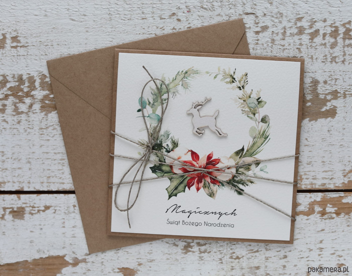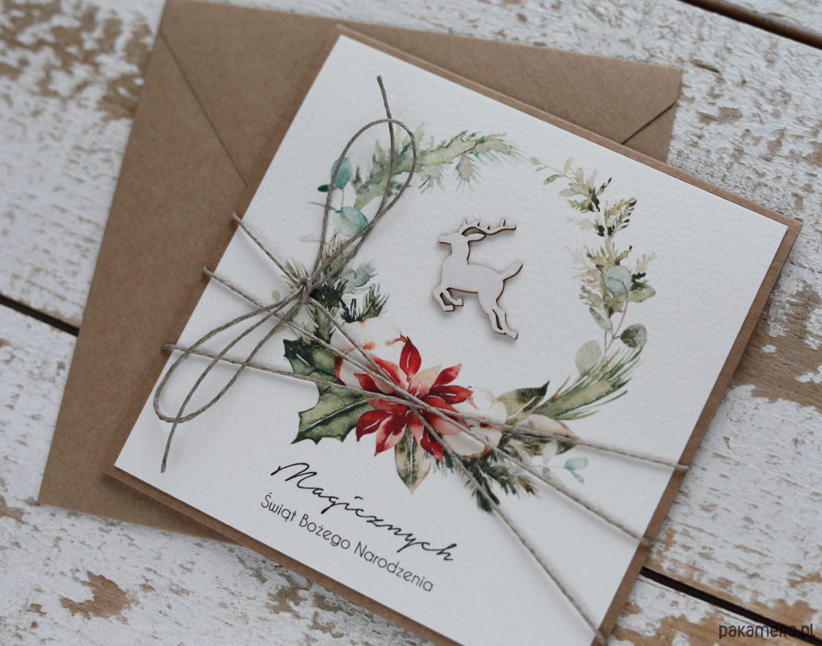 Kartka świąteczna na Boże Narodzenie ręcznie robiona świąteczny wianek i renifer