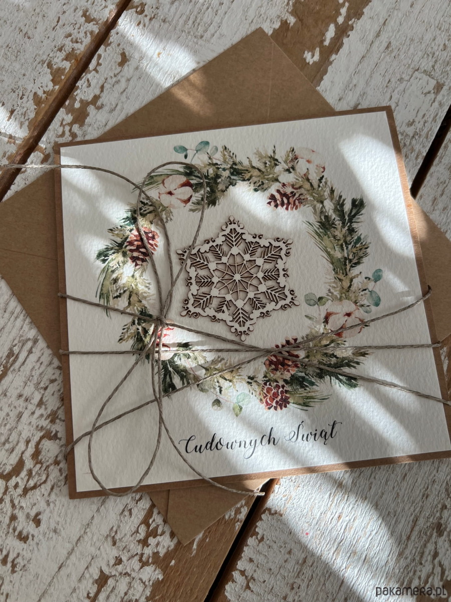 Kartka świąteczna na Boże Narodzenie ręcznie robiona z wiankiem i śnieżynką - gotowe najpiękniejsze życzenia świąteczne