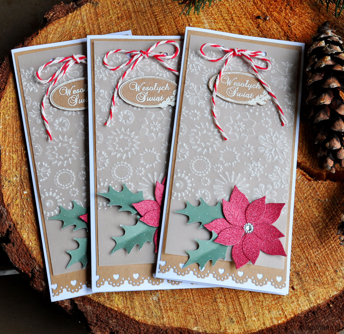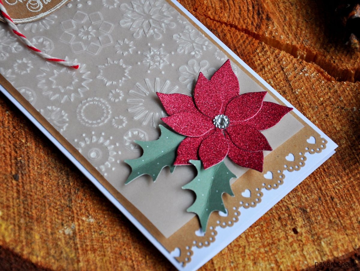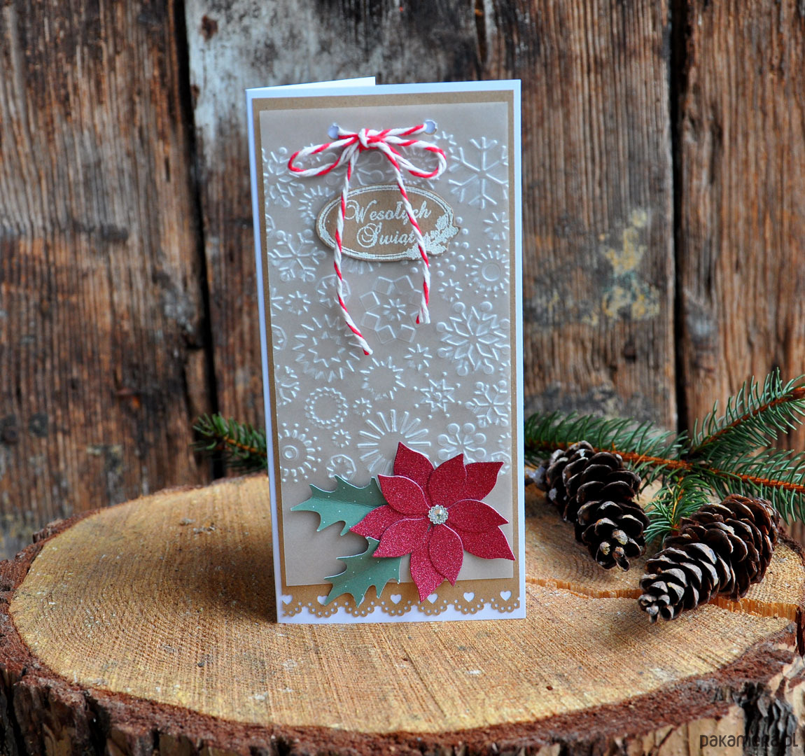 Piękna i wyjątkowa kartka świąteczna z kwiatem gwiazdy betlejemskiej; wymiary kartki 10x21cm, w komplecie koperta; zapraszam