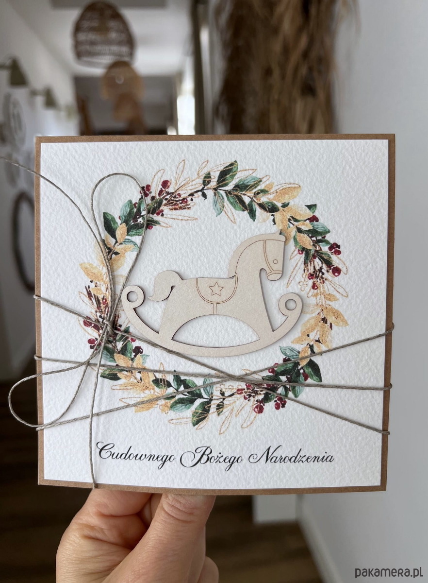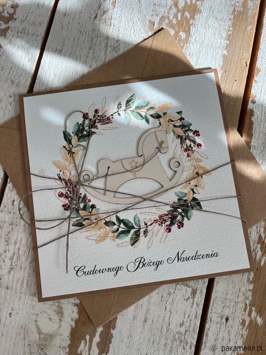 Kartka świąteczna ręcznie robiona na Boże Narodzenie konik na biegunach życzenia