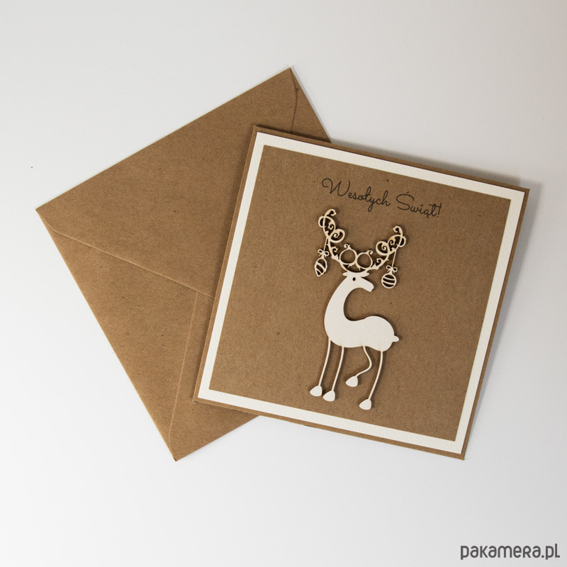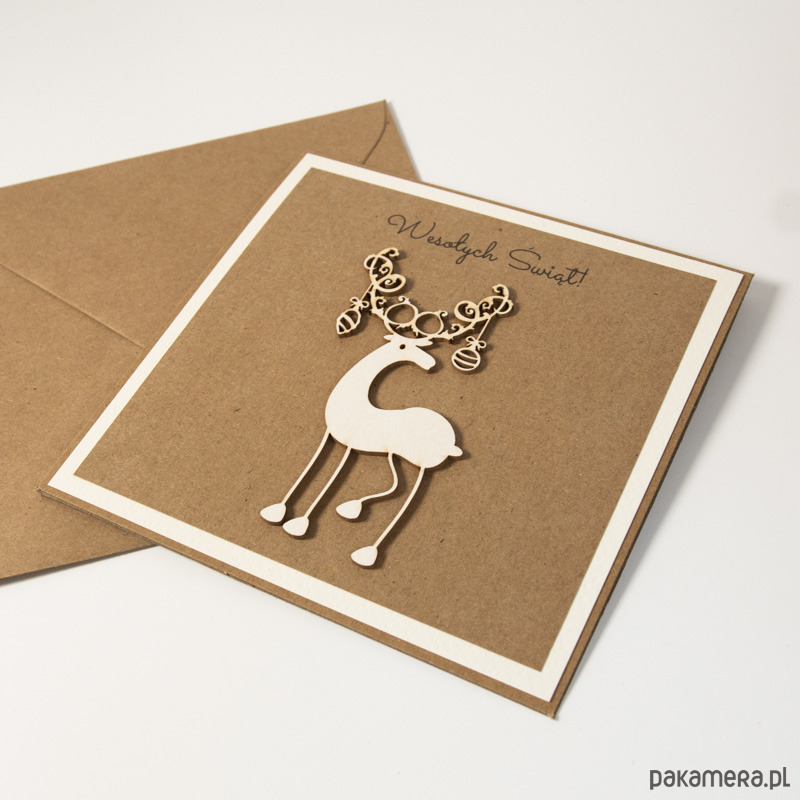 Kartka wykonana jest na brązowym ekologicznym papierze, na przodzie widnieje napis "Wesołych Świąt!" oraz dekoracja z motywem świątecznym (dekoracja jest lekko wypukła, co nadaje kartce wyjątkowego charakteru). Wnętrze kartki stanowi pusta wkładka, do ręcznego wypisania życzeń prosto z serca.