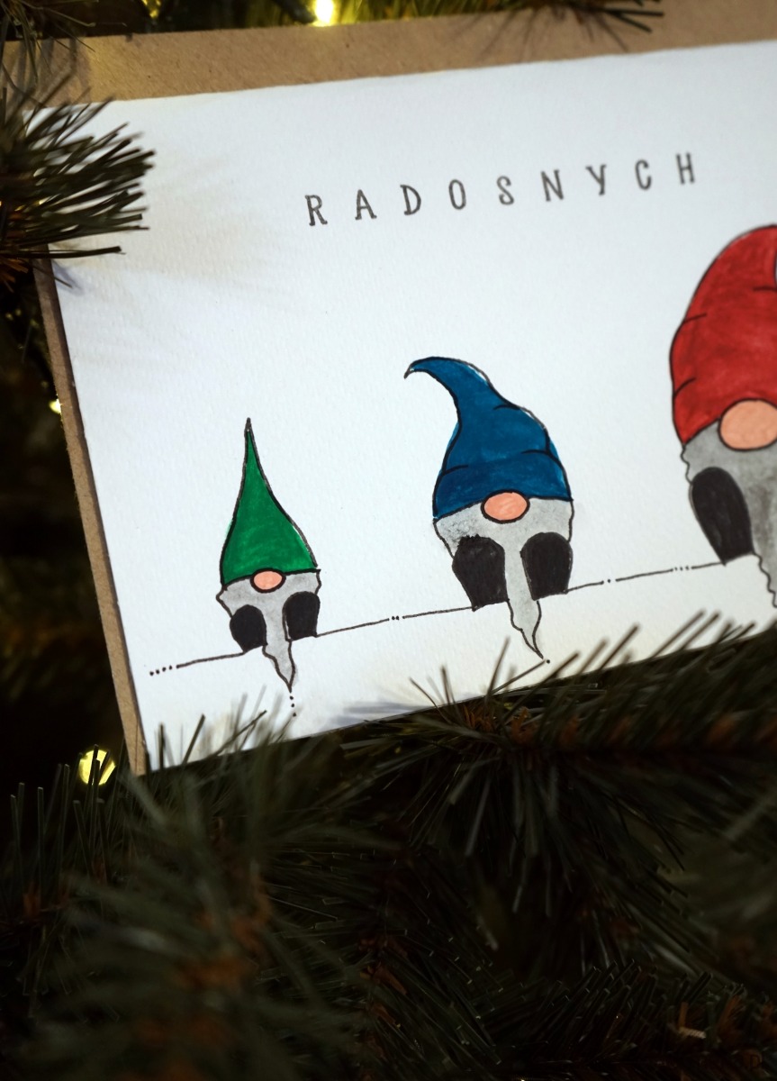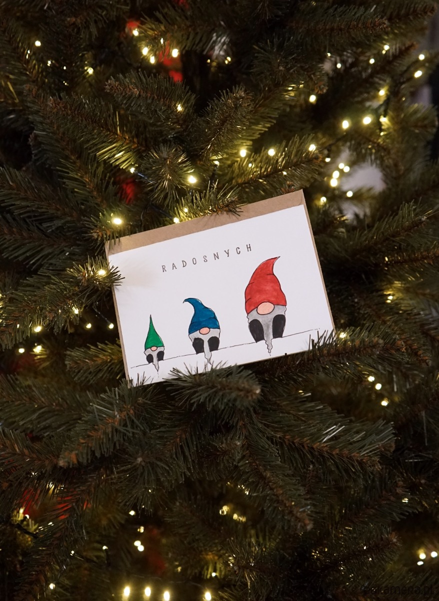 Ręcznie wykonana kartka świąteczna z motywem skrzatów.