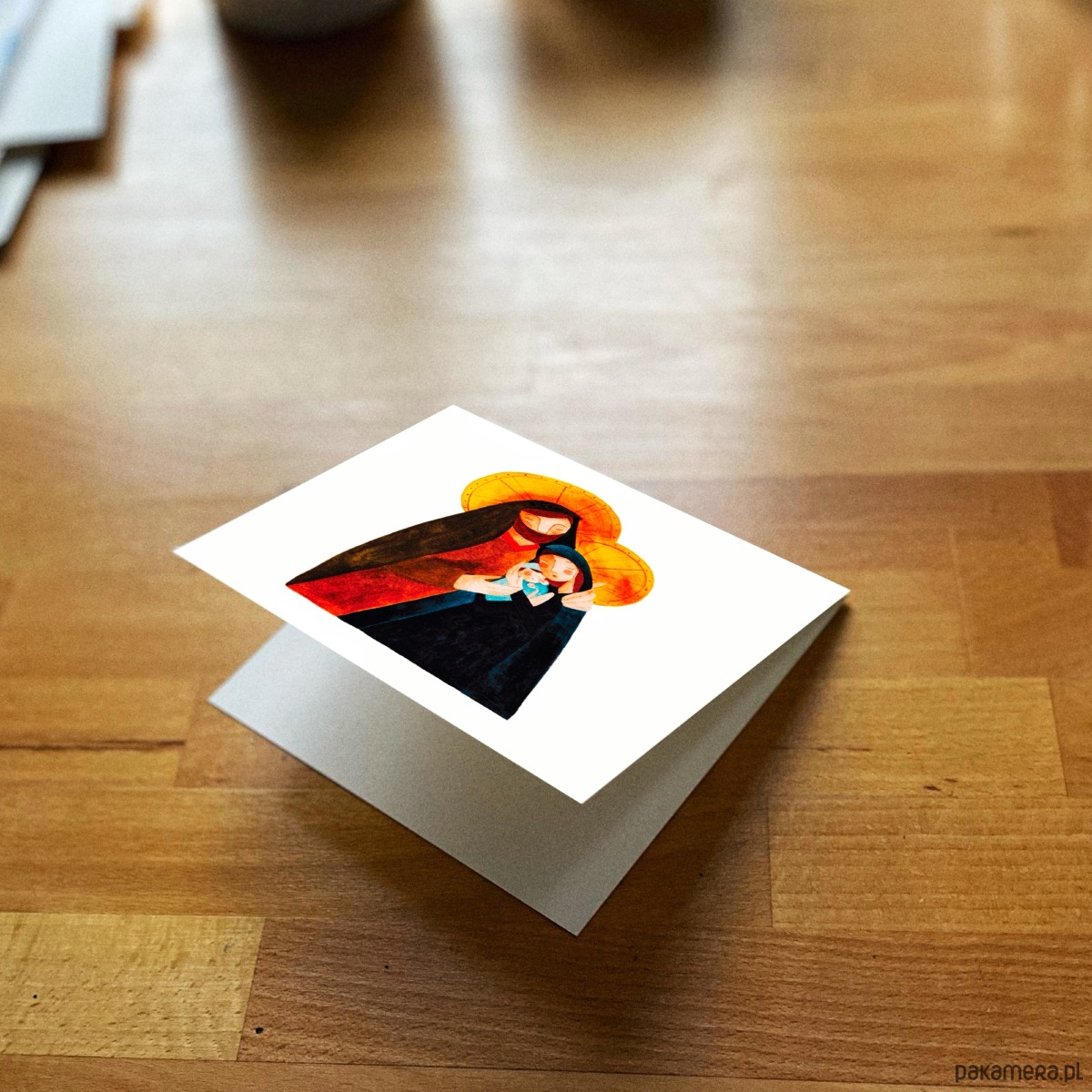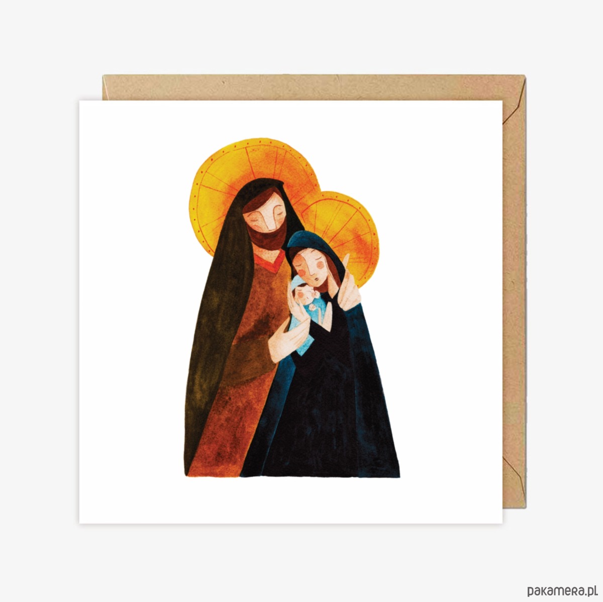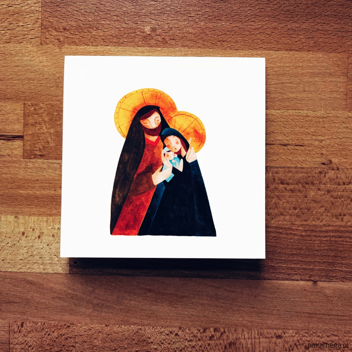 Autorska kartka świąteczna przedstawiająca Świętą Rodzinę z Dzieciątkiem.