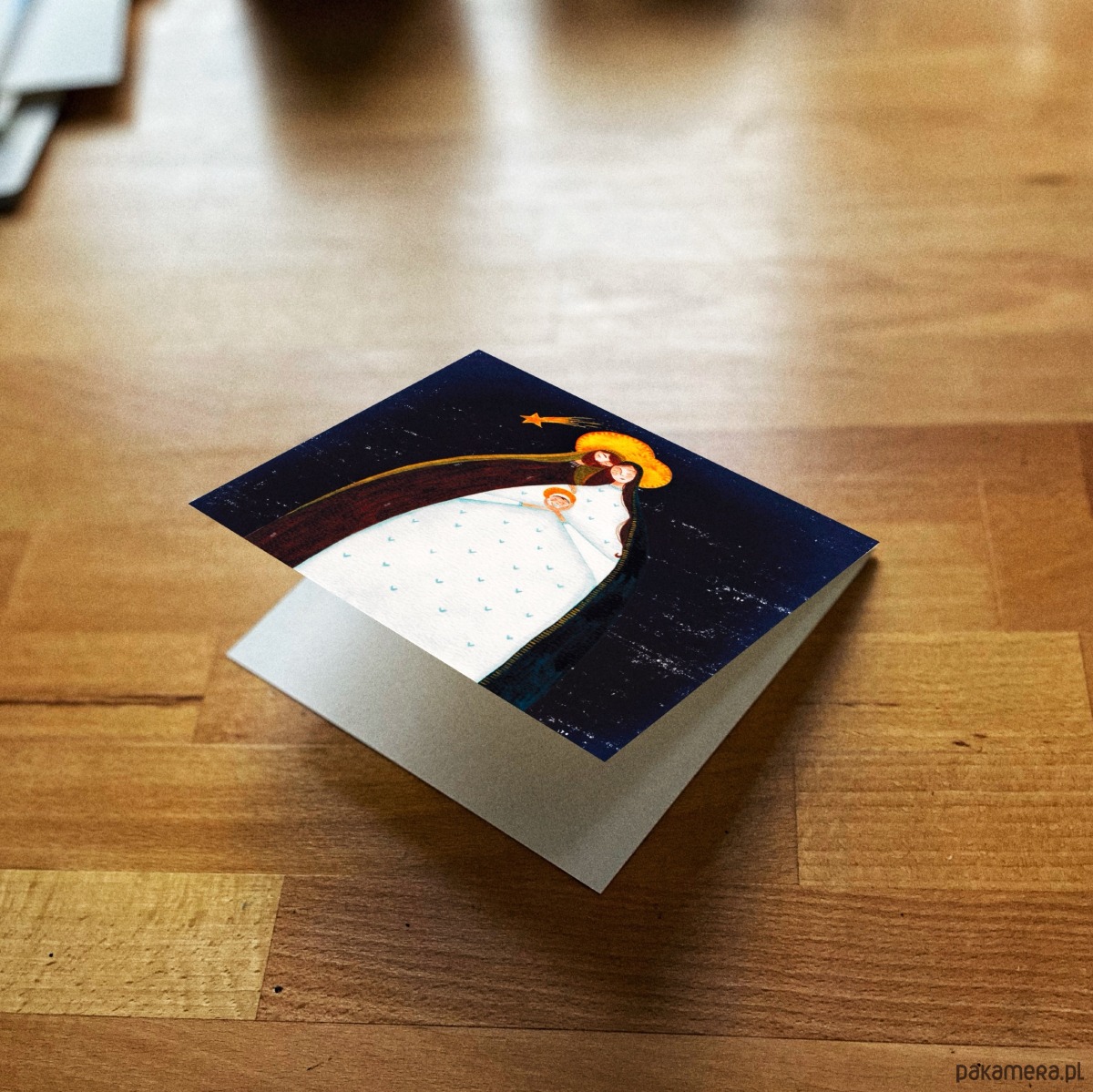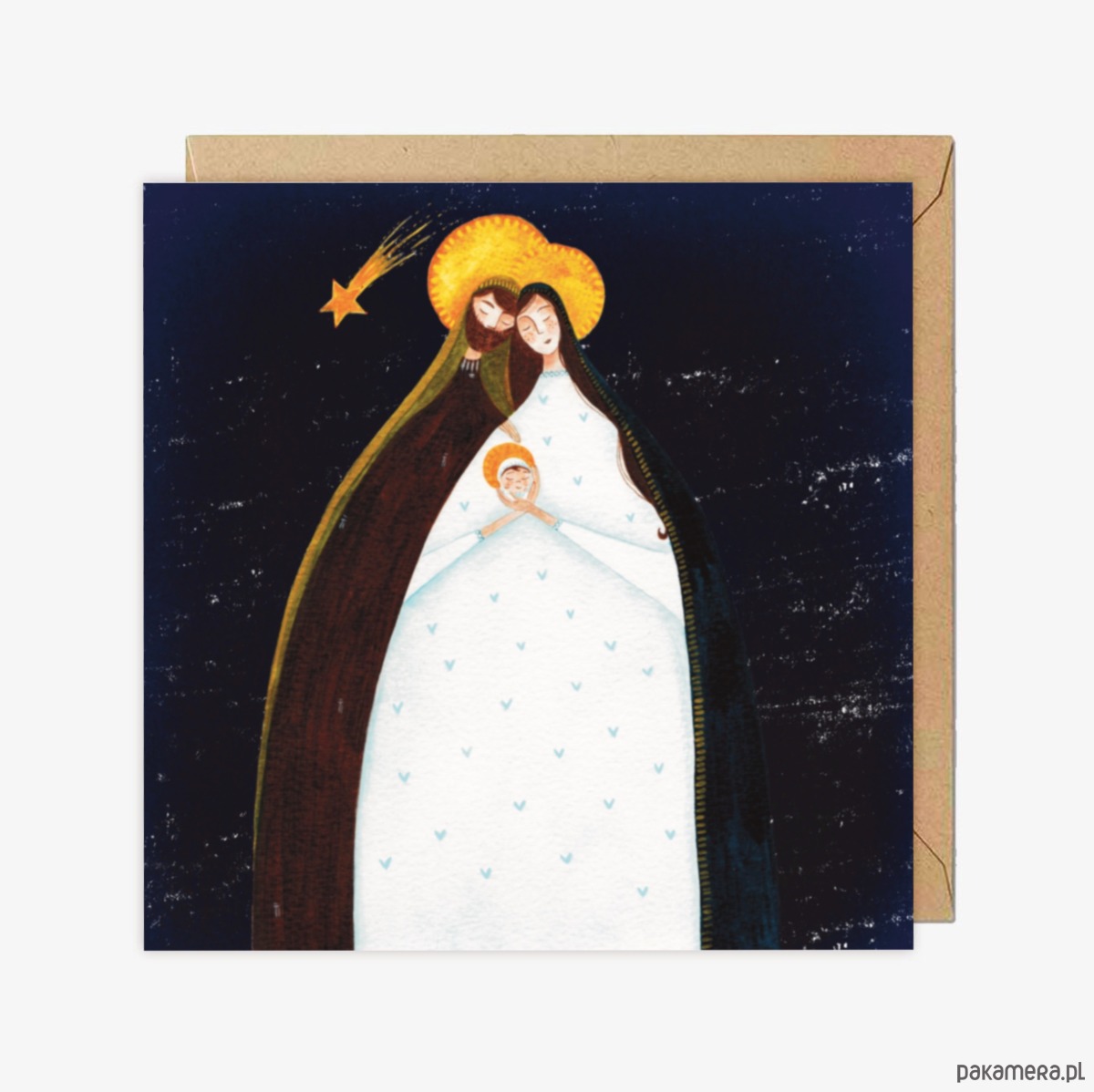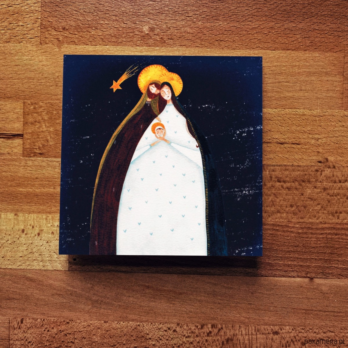 Autorska kartka świąteczna przedstawiająca Świętą Rodzinę z Dzieciątkiem.