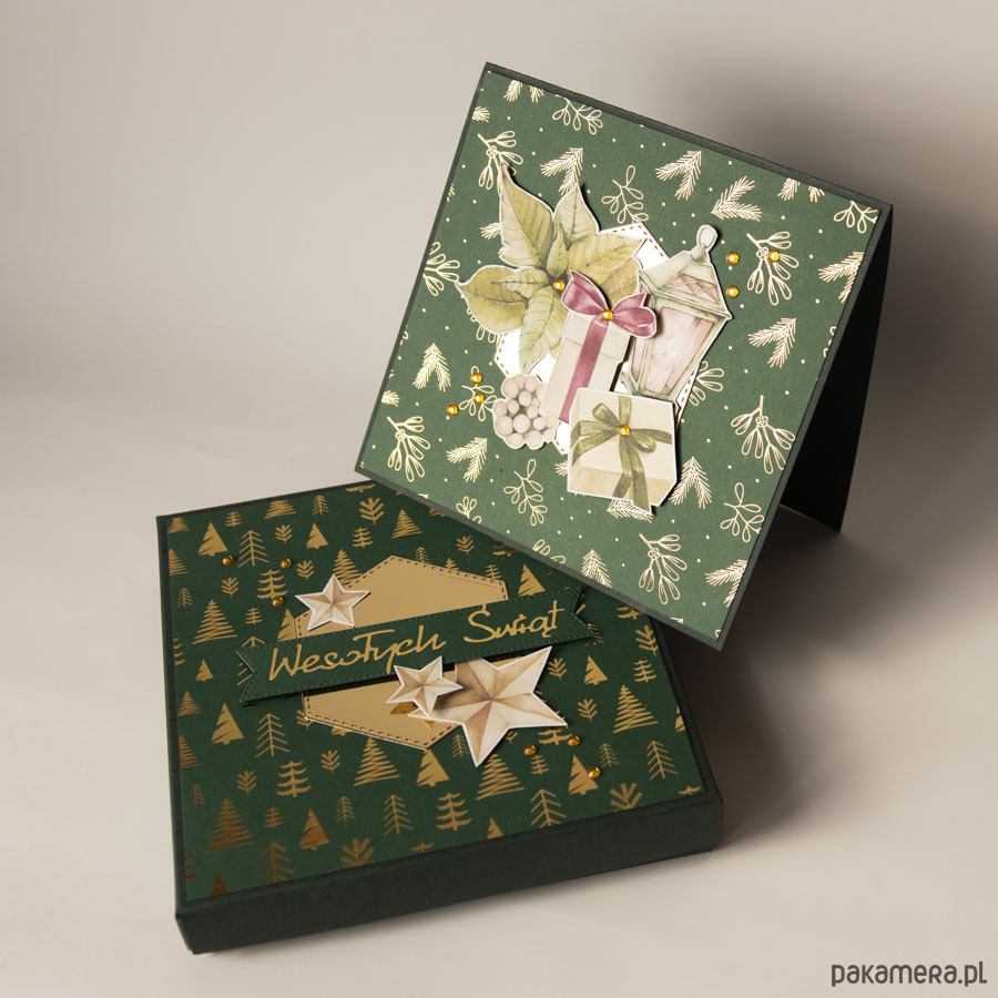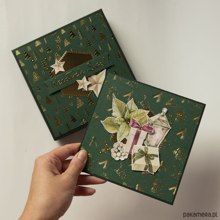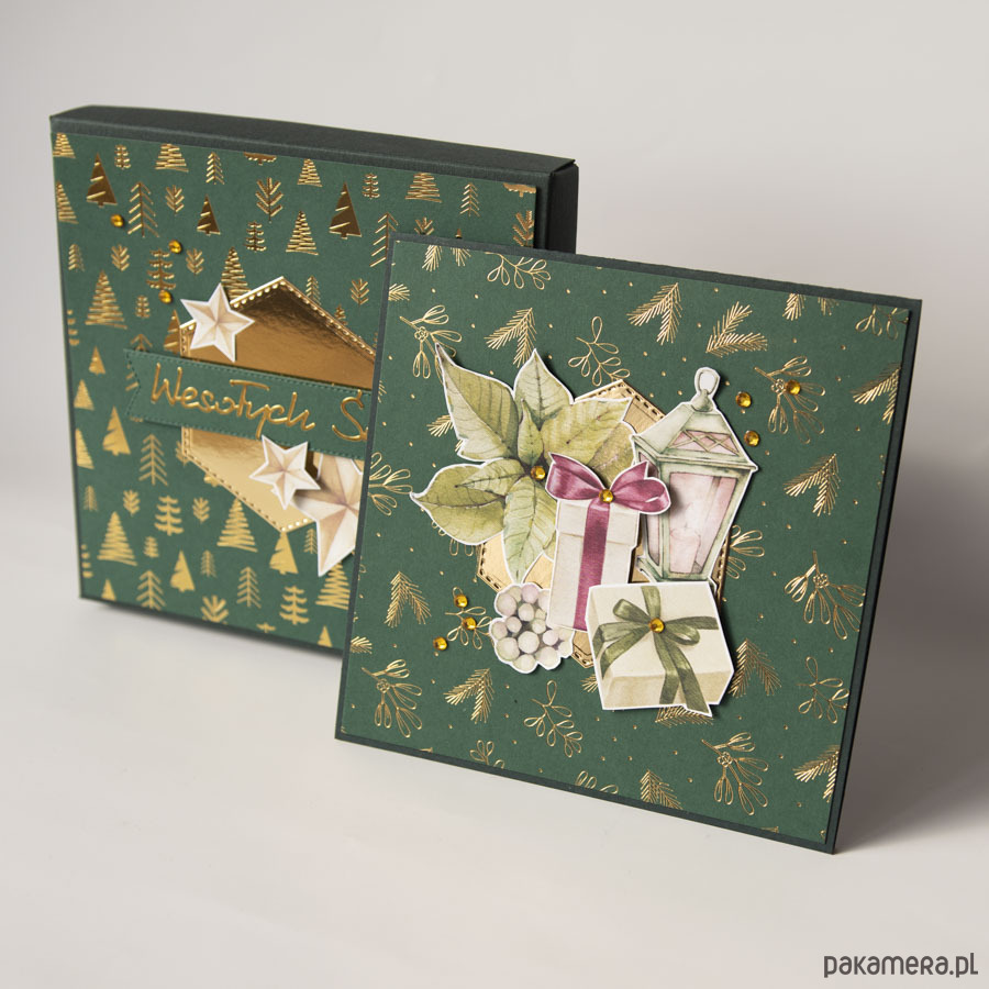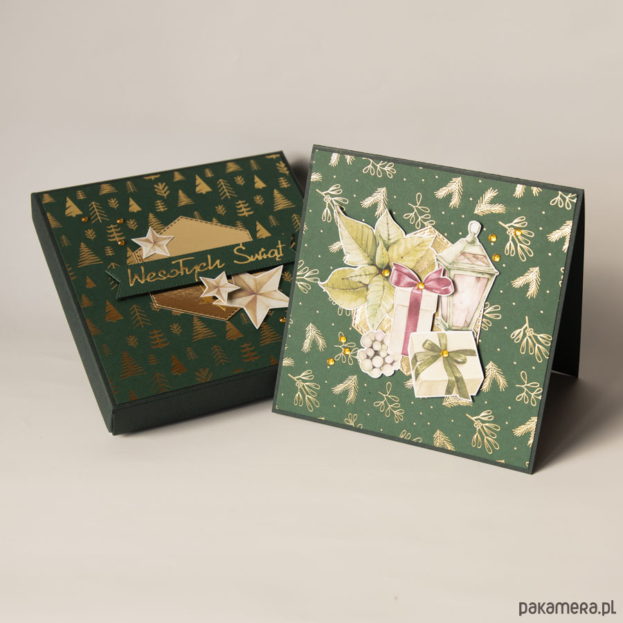 Ręcznie robiona kartka świąteczna w komplecie z dopasowanym pudełeczkiem. Kartka oraz pudełko są wykonane na bazie ciemnozielonego kartonu, zdobione papierem ze złoconymi wzorami i ręcznie wycinanymi papierowymi dekoracjami.