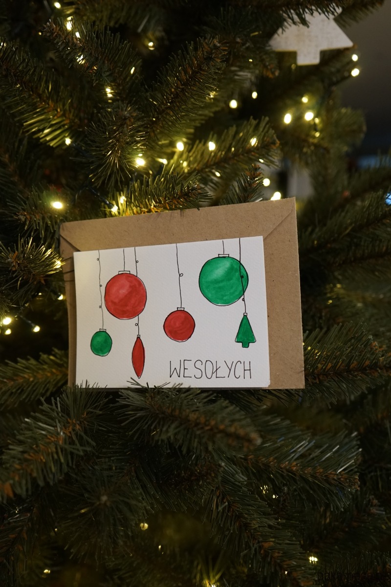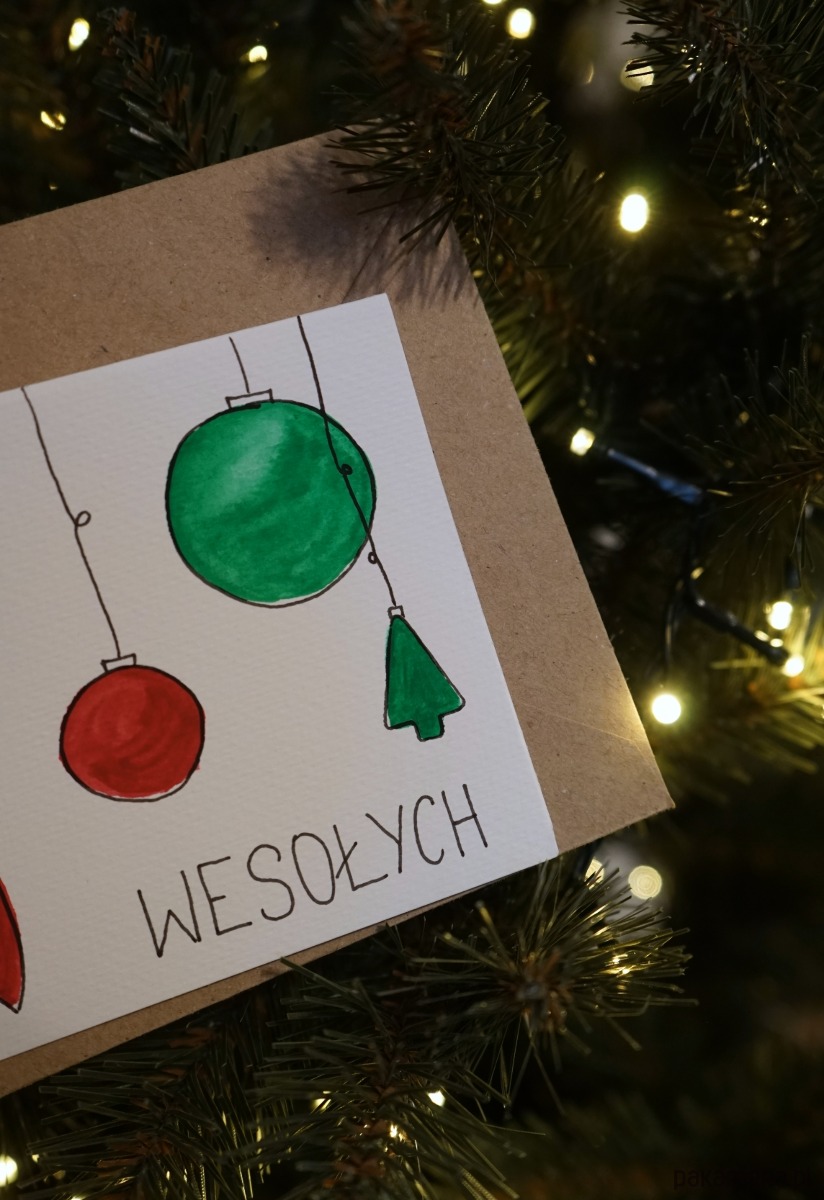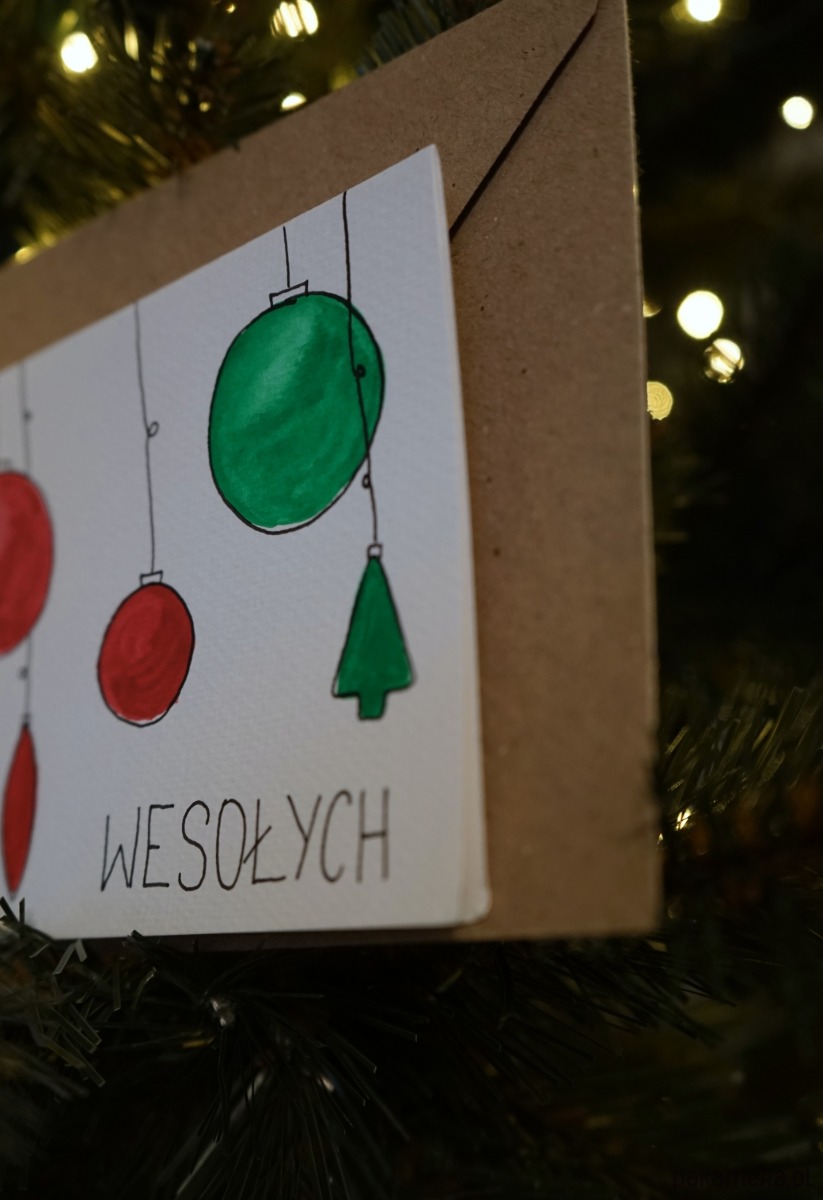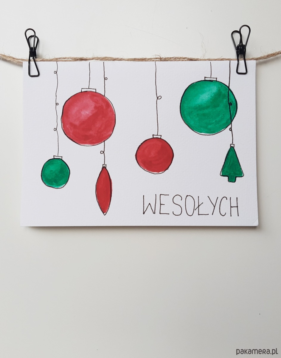 Ręcznie malowana kartka świąteczna z motywem czerwonych i zielonych bombek.