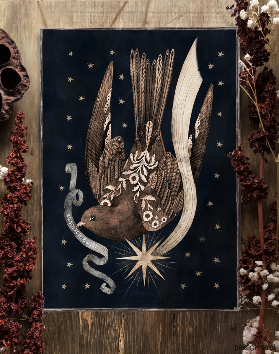Kartka Świąteczna "Wesołych Świąt" z autorską ilustracją Ptaka i Gwiazdy Betlejemskiej.
