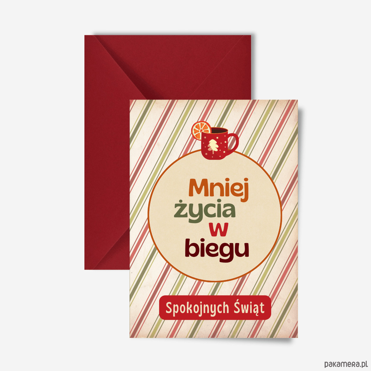 W klasycznych kolorach zgrabnie dobranych i połączonych, ta kartka znajdzie się w kanonie tych ulubionych. Z prostą czcionką i życzeniami spokojnych świąt Bożego Narodzenia, karnet ma w środku masę miejsca do wypełnienia. Pasuje do każdego, bo nie masz człowieka, który z utęsknieniem na pierwszą gwiazdkę nie czeka. Święta to czas, kiedy trzeba wzruszać miłym gestem, szczerymi życzeniami i dzielić się świąteczną radością z bliskimi osobami. Niechaj więc bożonarodzeniowa magia zamknięta w tym karnecie rozejdzie się po całym świecie. Dla rodziców, dziadków, wujostwa, kuzynostwa, siostry, brata, szefa, przyjaciółki czy kolegów z pracy, czy bliskiego znajomego, kartka z życzeniami, czyli coś prostego, ale jakże wyjątkowego.