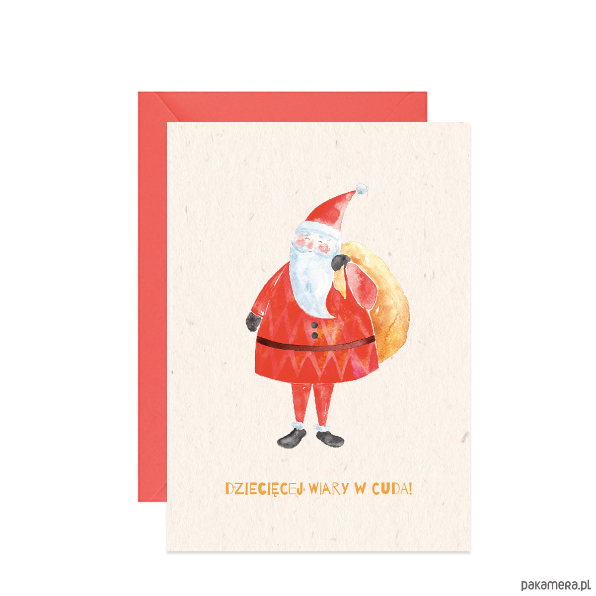 Kartka świąteczna z Mikołajem i workiem prezentów. Doskonale sprawdzi się w roli karty na najserdeczniejsze życzenia na wiele okazji: od zimowych urodzin po Boże Narodzenie.
