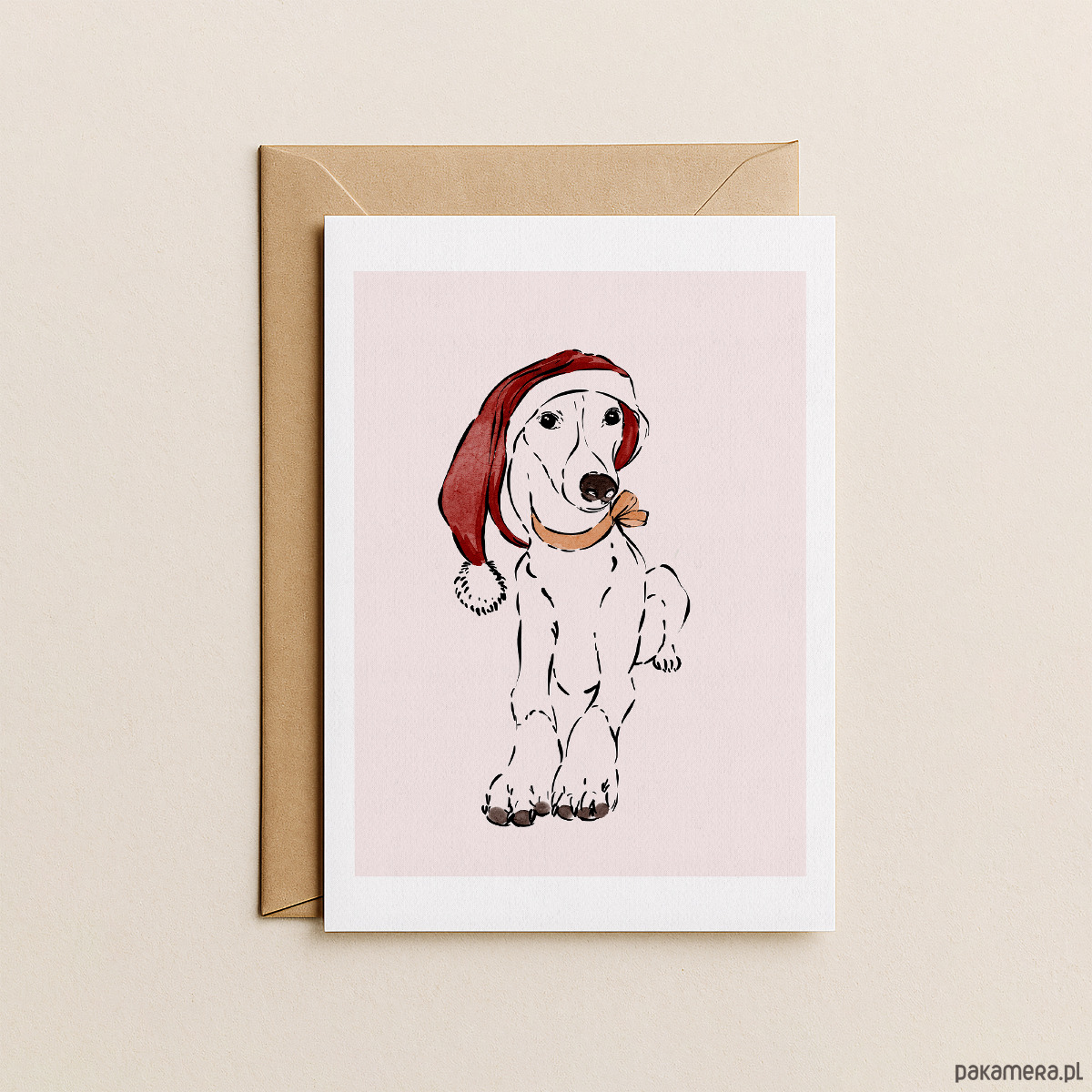 Kartka zawiera autorską ilustrację z charcikiem w mikołajkowej czapce.