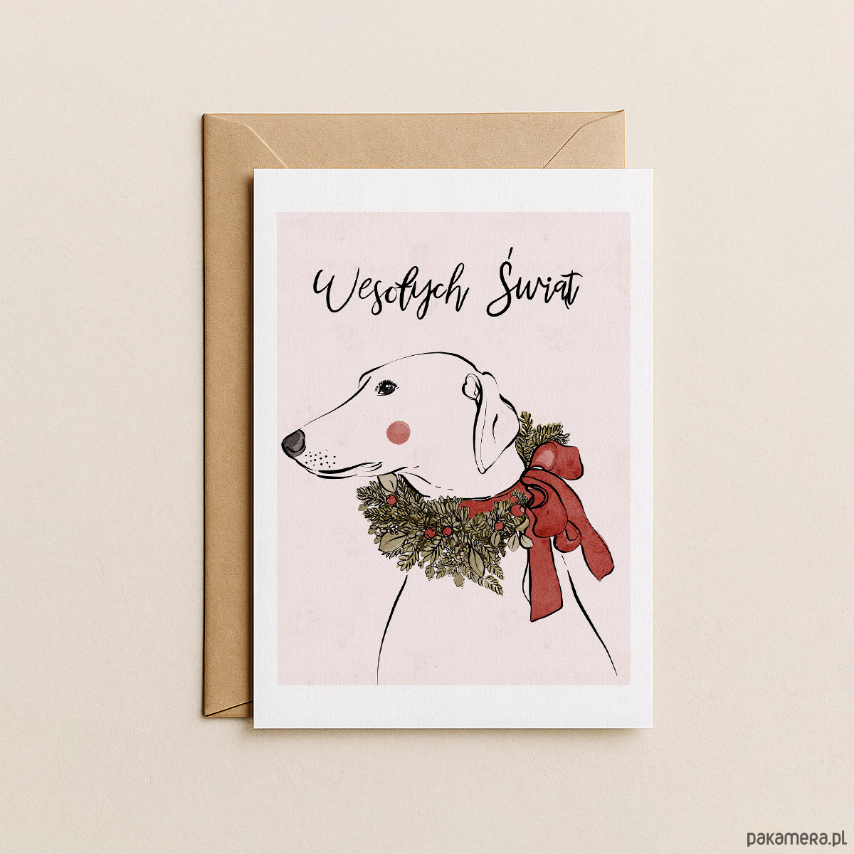 Kartka zawiera autorską ilustrację z pieskiem ze świątecznym wiankiem.