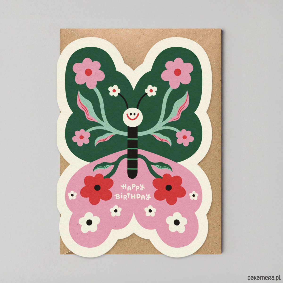 Świętuj ważne chwile z tą niezwykłą kartką urodzinową zaprojektowaną przez Edytę Demurat. Produkt wyróżnia się autorskim kształtem motyla oraz subtelną kolorystyką łączącą głęboką, leśną zieleń z pastelowym różem w kwiatowe wzory. Całość wieńczy uroczy uśmiech motyla i minimalistyczny napis „Happy Birthday”.