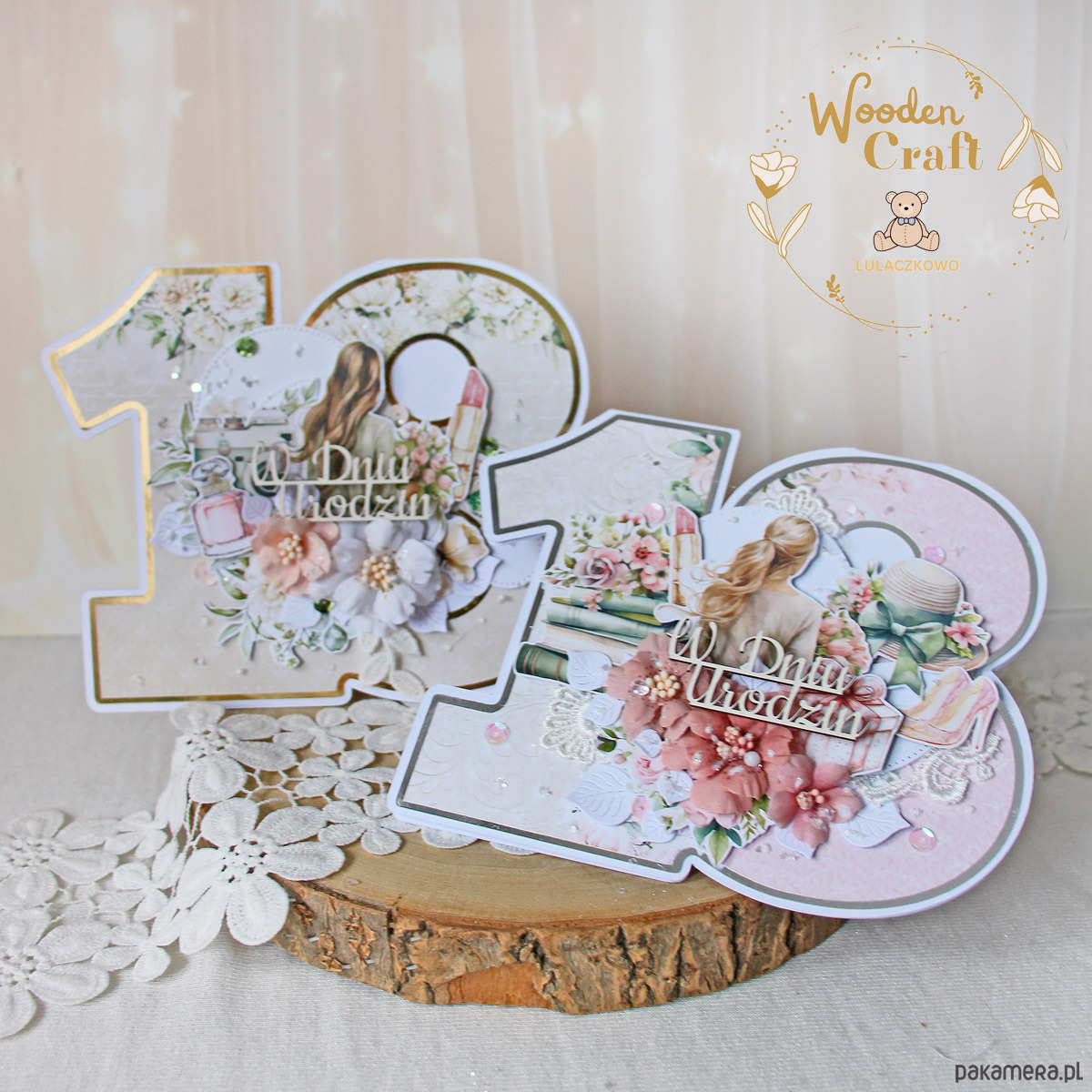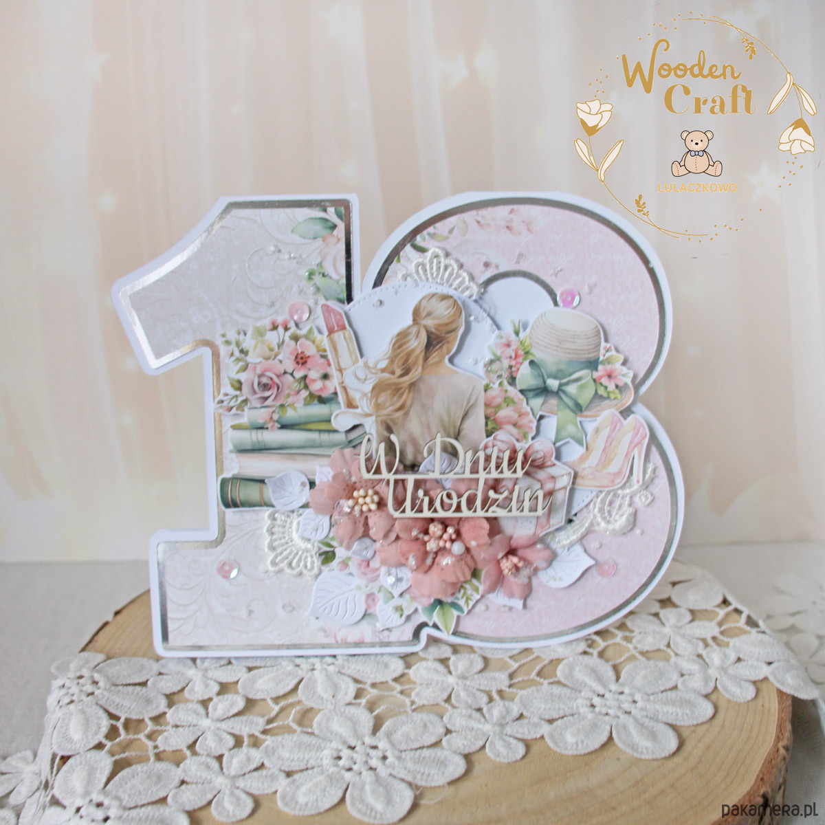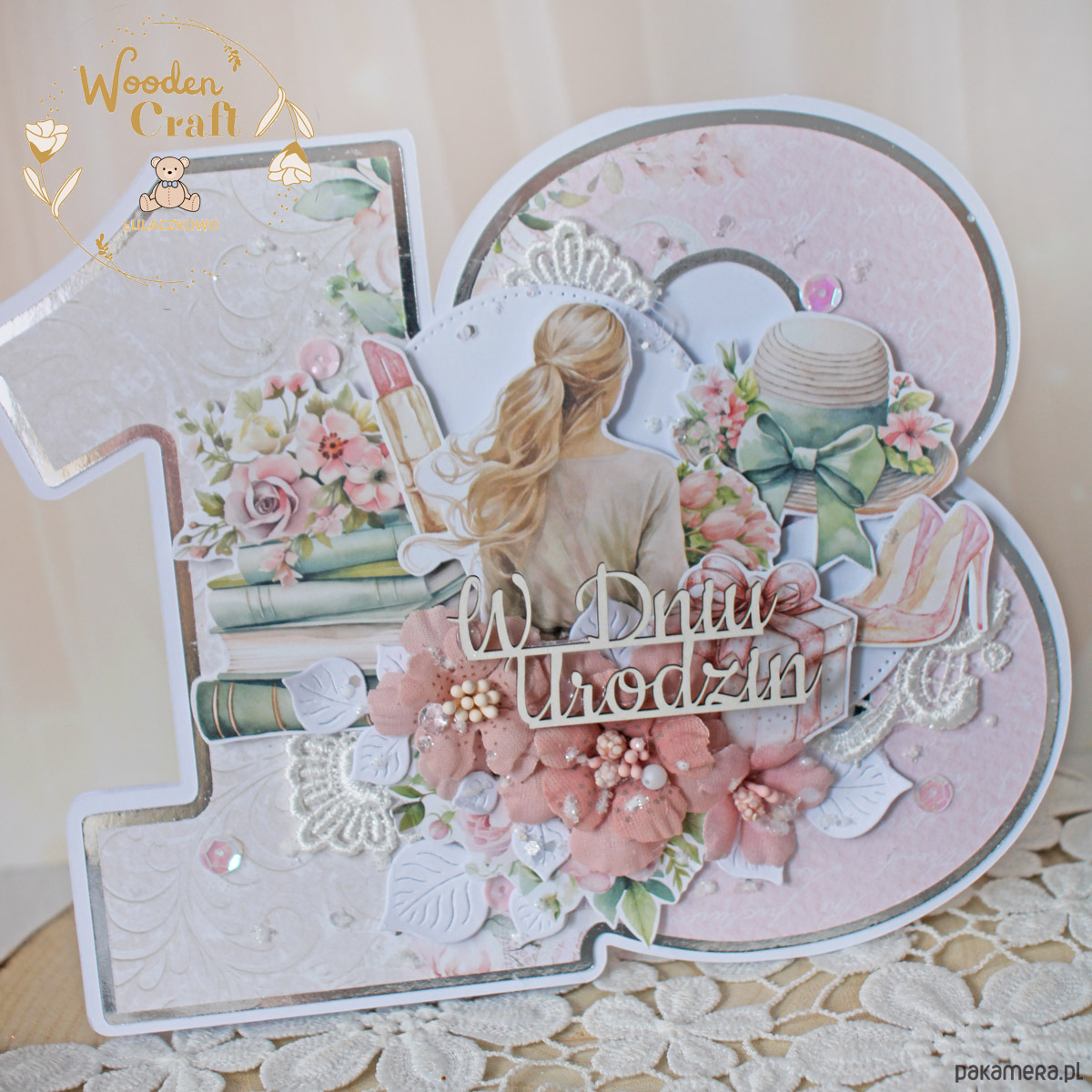 Przepiękna, delikatna kartka na 18 urodziny w kształcie liczby 18, wykonana ręcznie z dbałością o każdy szczegół. Kartka utrzymana w odcieniach pudrowego różu, bieli i beżu, z dodatkiem srebrnych, błyszczących akcentów, wykonana z przepięknej kolekcji papierów "Mum's Love".