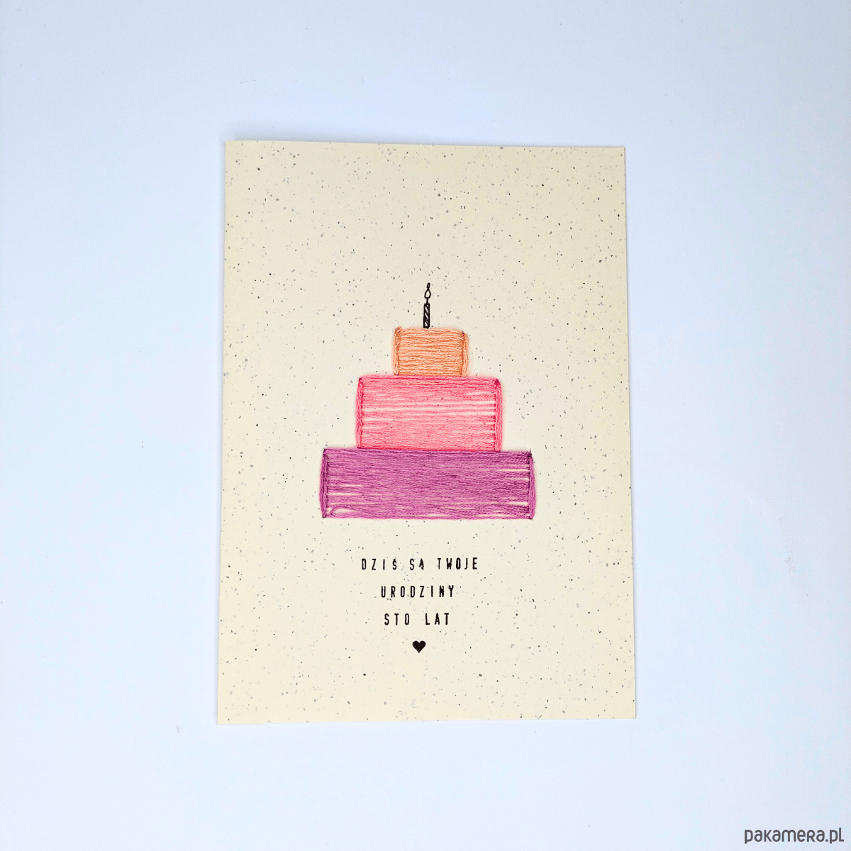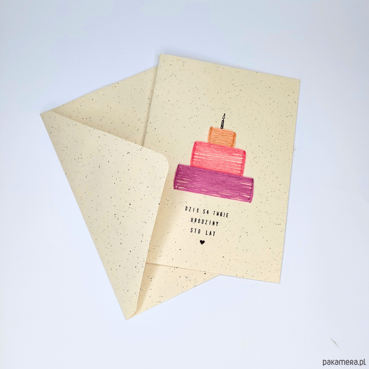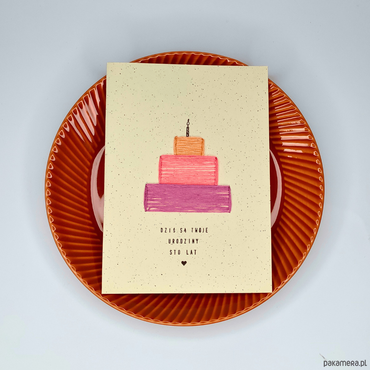 Minimalistyczny, ale bardzo wyrazisty tort w odcieniach różu i pomarańczy został ręcznie wyhaftowany na naturalnym papierze, przywodzącym na myśl dawne zeszyty i babcine notatki. Pod nim proste, klasyczne życzenia: "Dziś są Twoje urodziny. Sto lat." Idealne tło dla Twoich własnych życzeń, płynących prosto z serca.