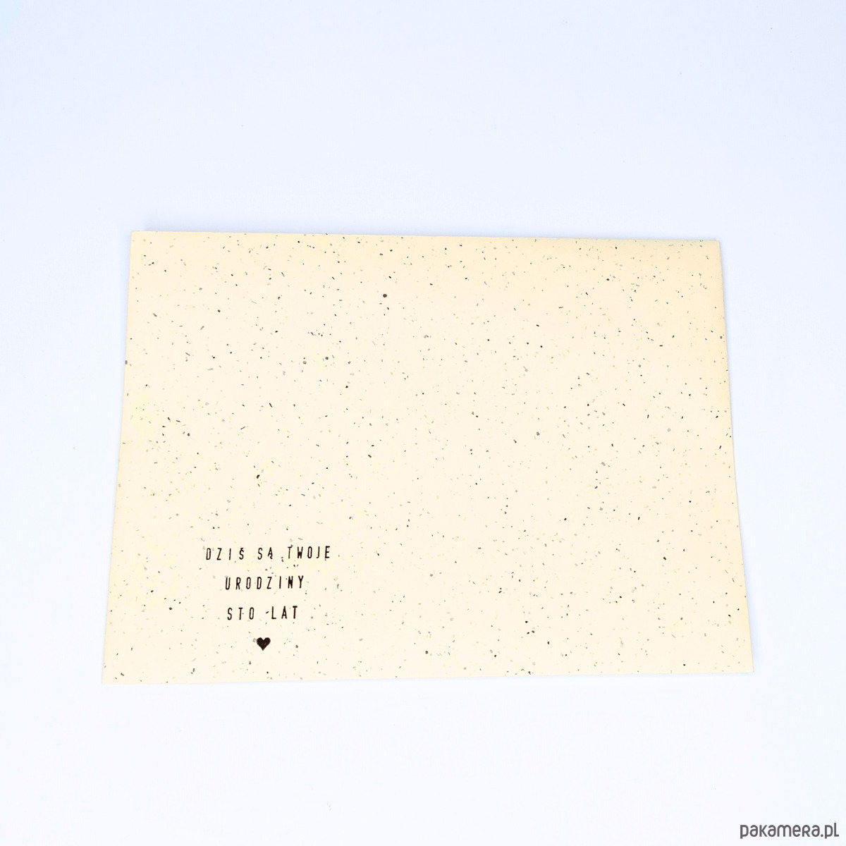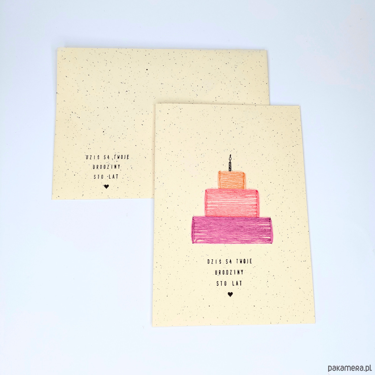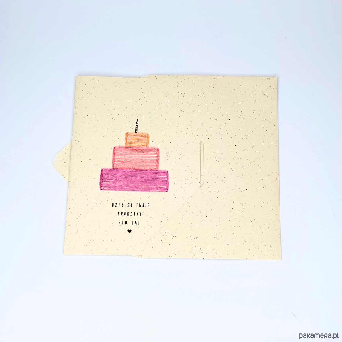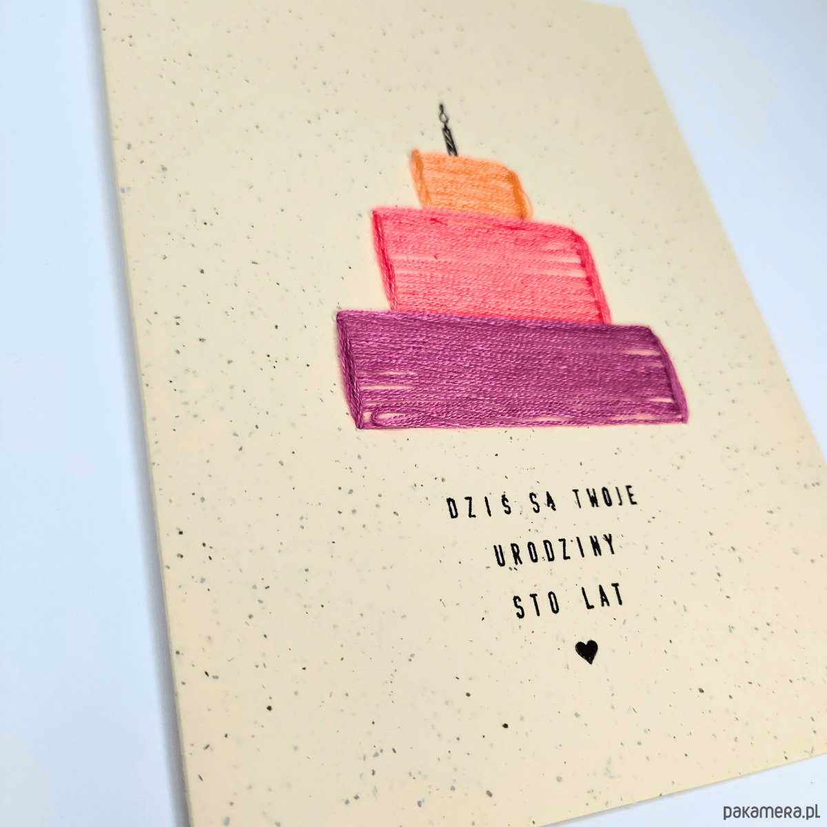 Minimalistyczny, ale bardzo wyrazisty tort w odcieniach różu i pomarańczy został ręcznie wyhaftowany na naturalnym papierze, przywodzącym na myśl dawne zeszyty i babcine notatki. Pod nim proste, klasyczne życzenia: "Dziś są Twoje urodziny. Sto lat." Idealne tło dla Twoich własnych życzeń, płynących prosto z serca.