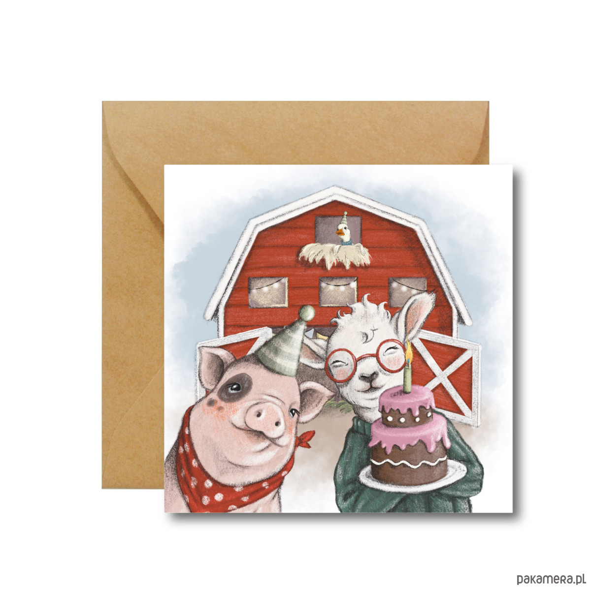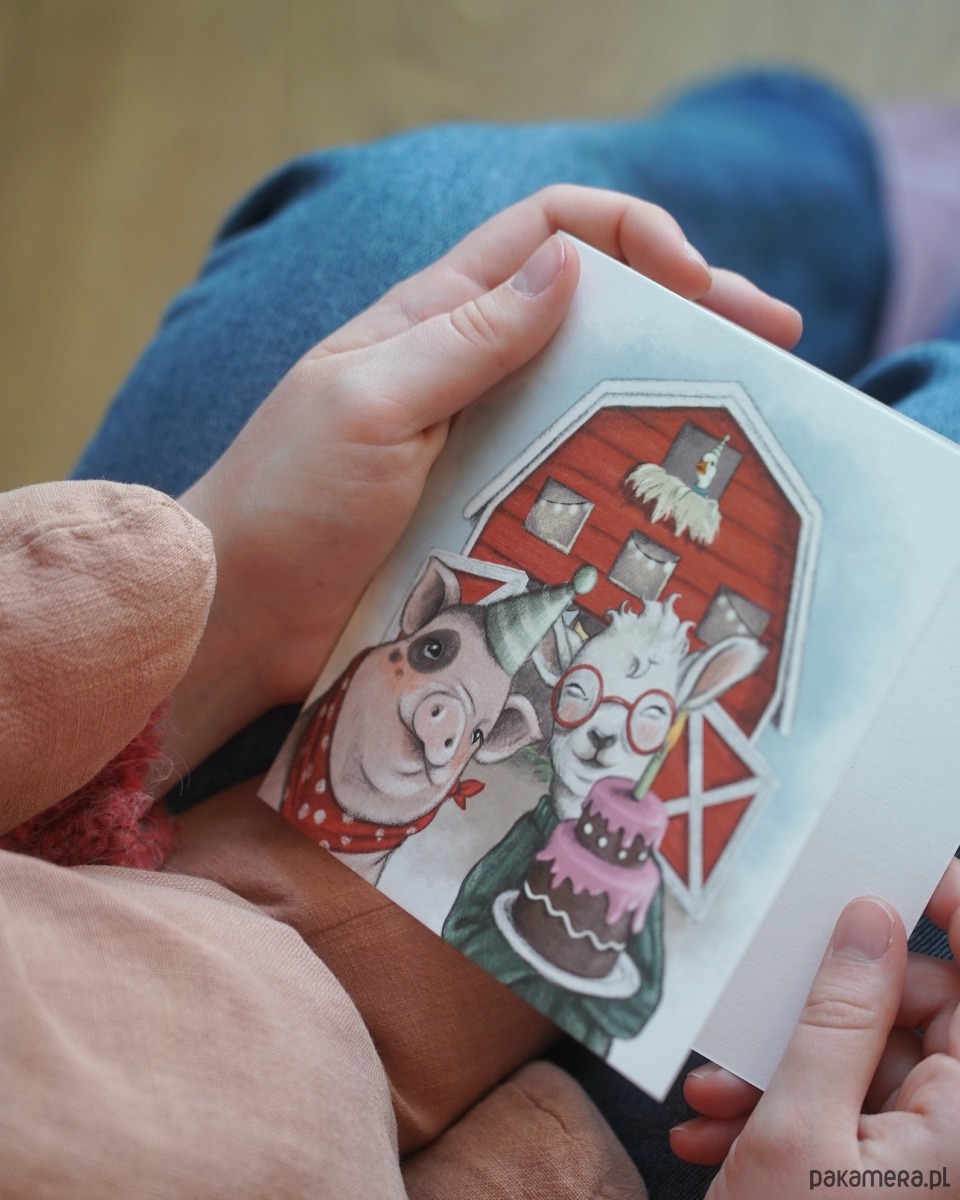 Piękna kartka urodzinowa ze zwierzątkami bawiącymi się na przyjęciu na wsi. Urocza świnka, robiąca selfie razem z owieczką trzymającą tort. Zaraz pójdą zrobić niespodziankę solenizantowi.