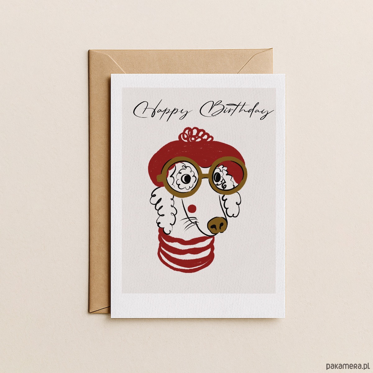 Kartka zawiera autorską ilustrację z pieskiem w berecie.