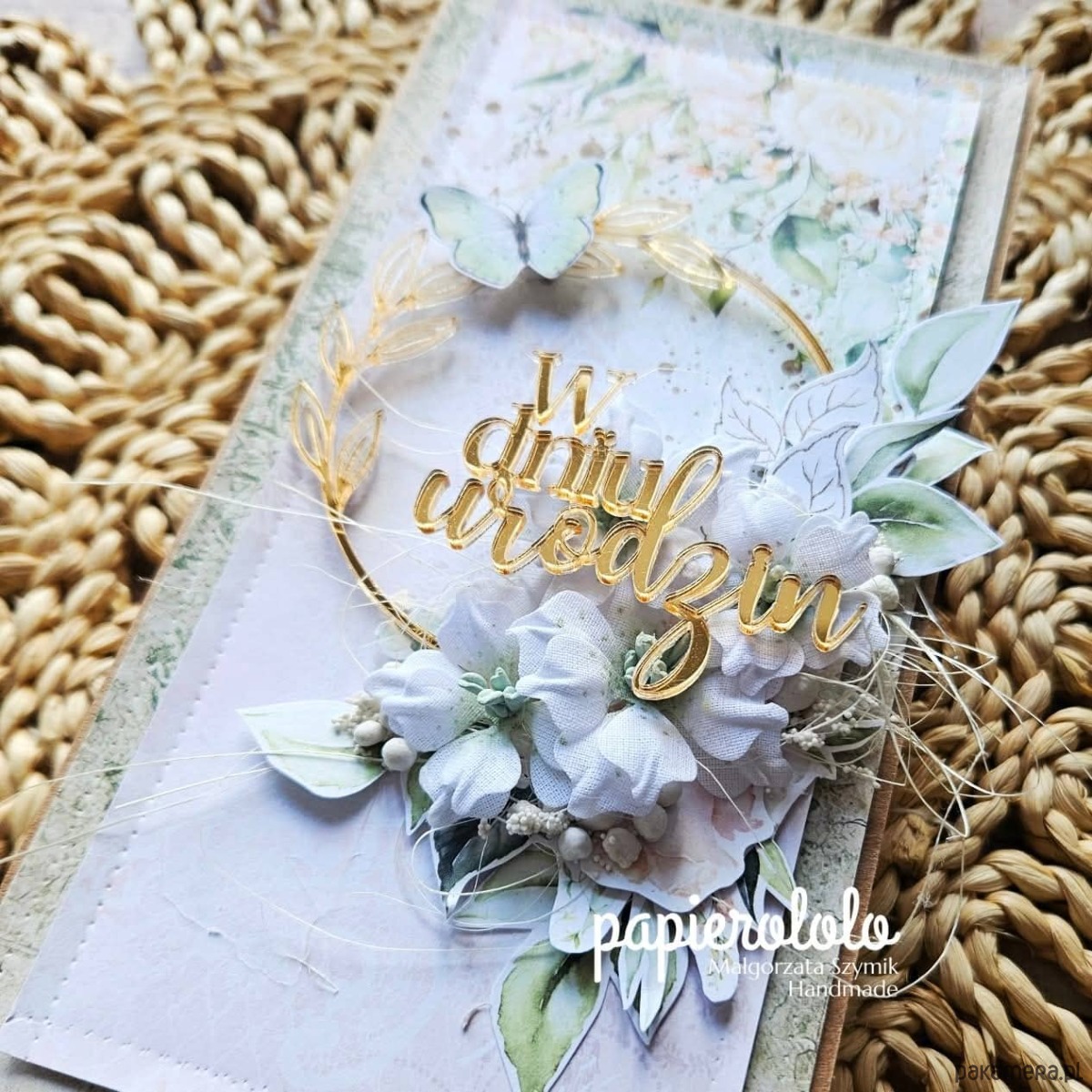 Elegancka kartka z okazji urodzin. Wykonana z papieru z nadrukiem i ozdobiona kwiatami z materiału oraz papierowymi dodatkami.