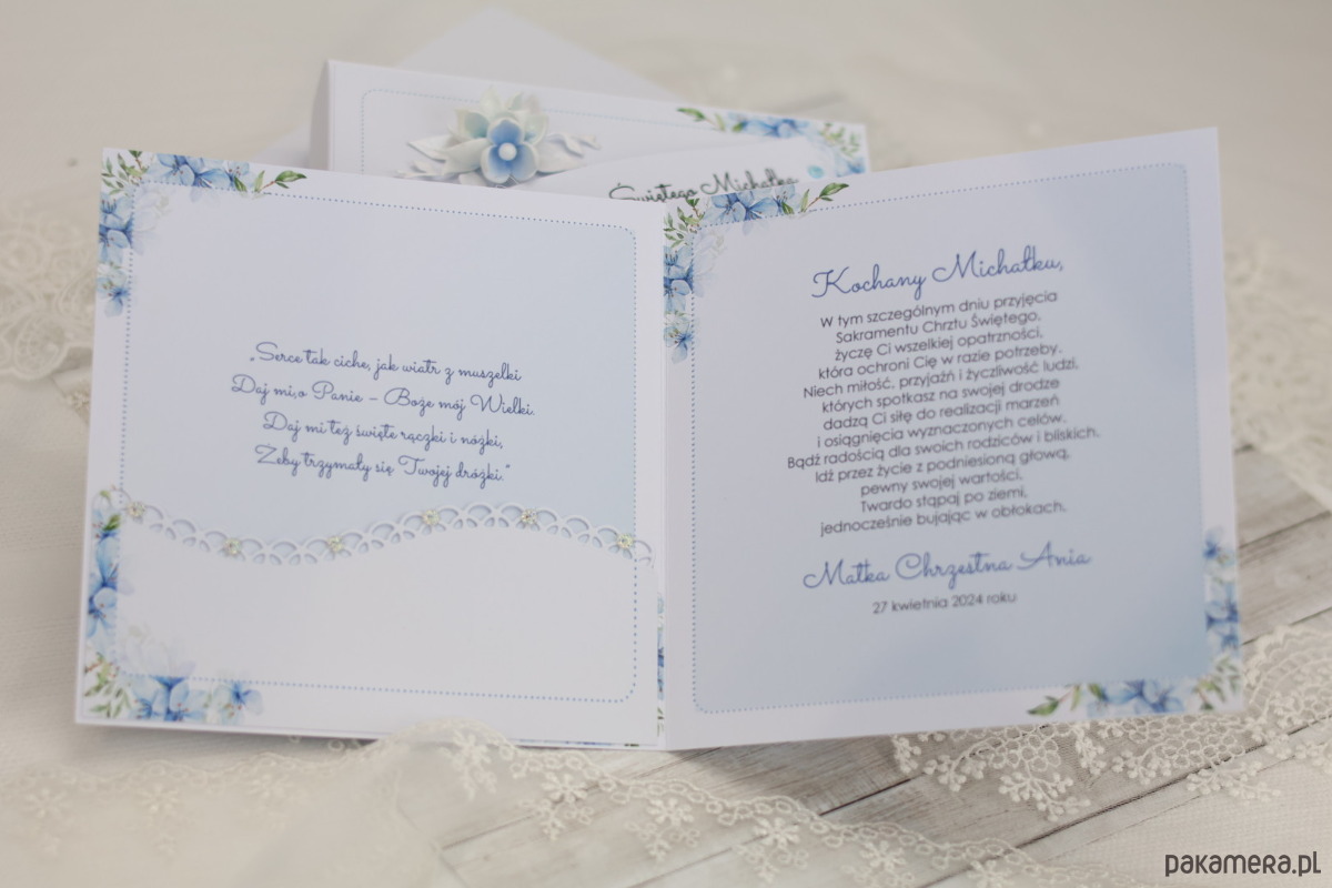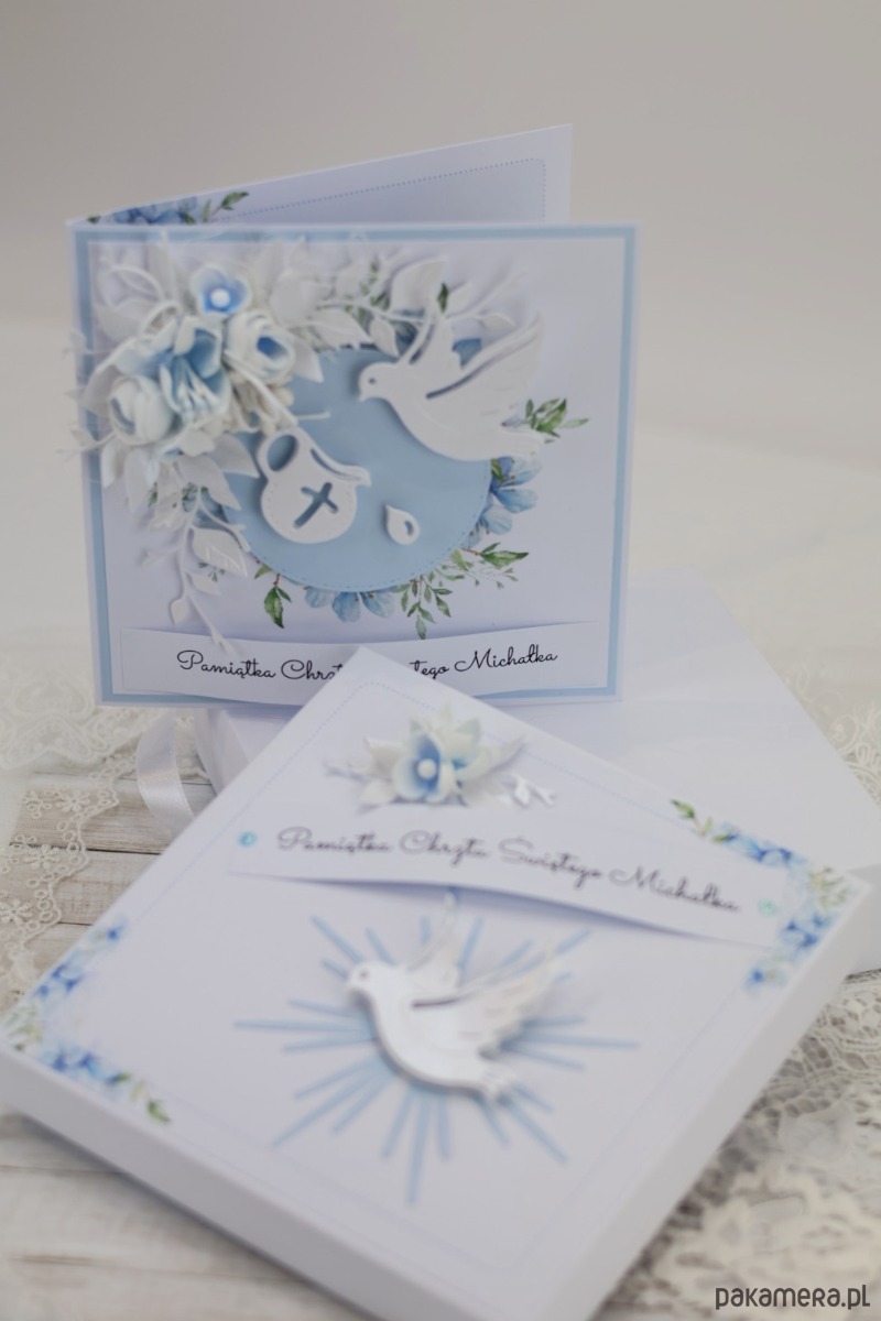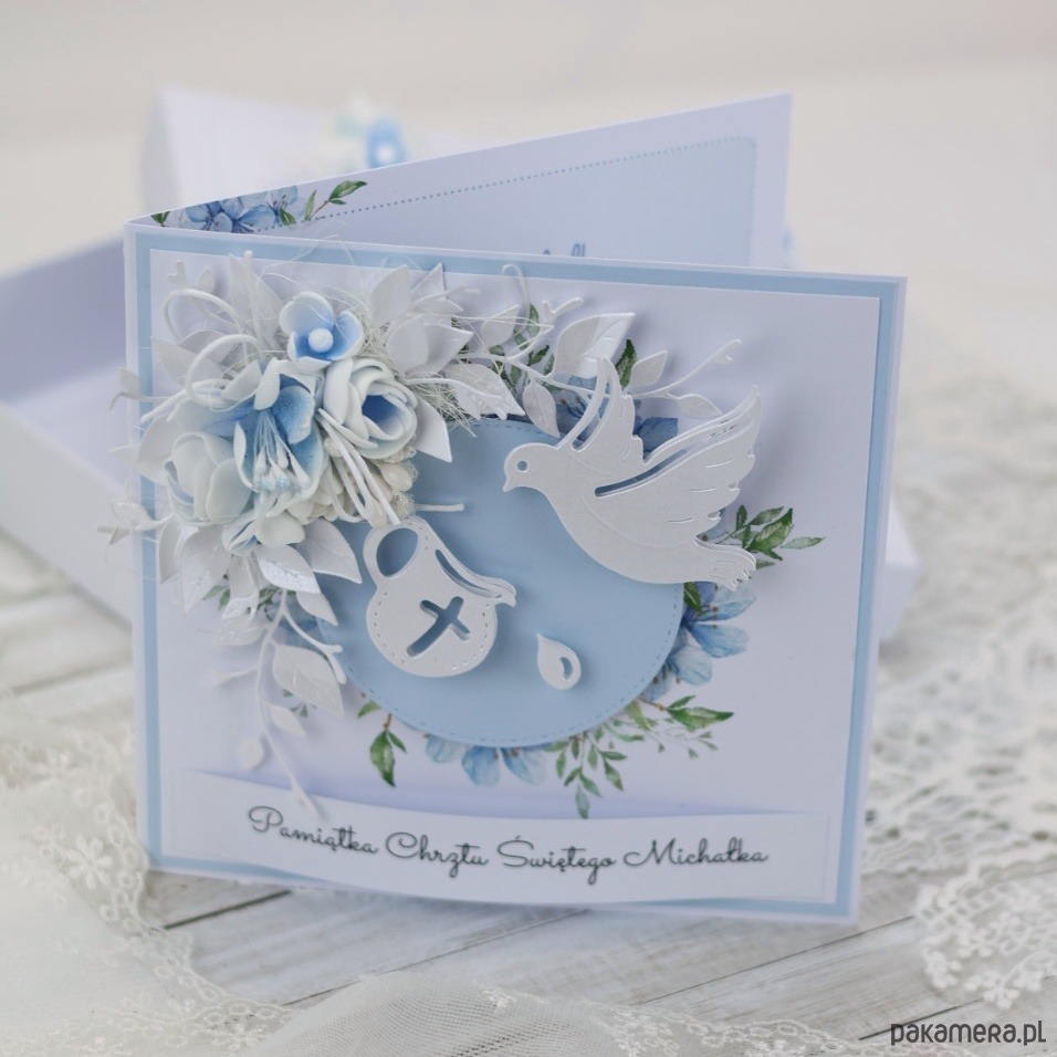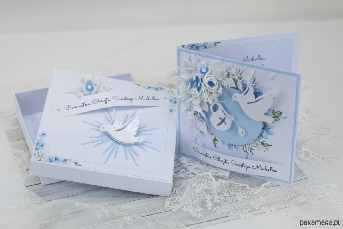 Ręcznie tworzona kartka w pudełku z okazji chrztu świętego dla chłopca z pewnością podkreśli wyjątkowość uroczystości oraz będzie piękną pamiątką dla maluszka.