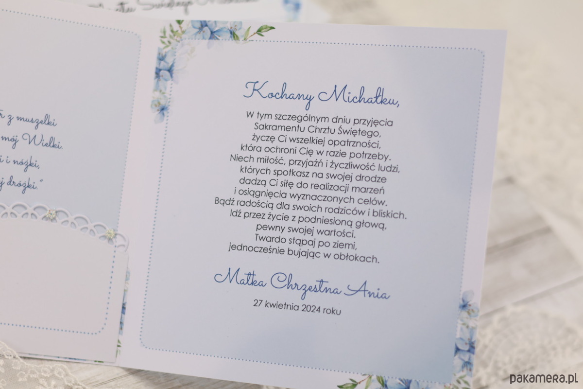 Wewnątrz kartki jest miejsce na osobistą dedykację bądź życzenia, cytat i kieszonkę na pieniądze.