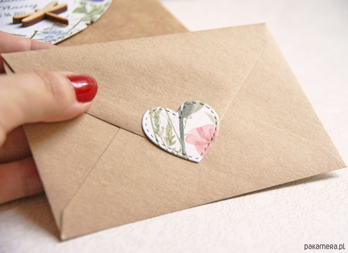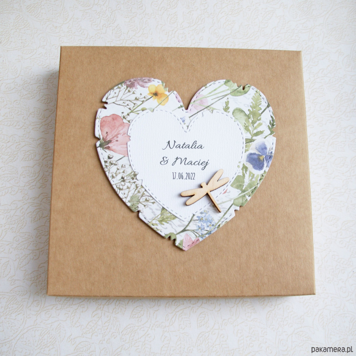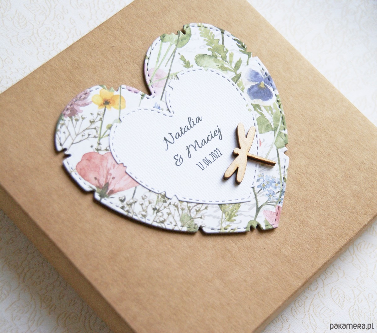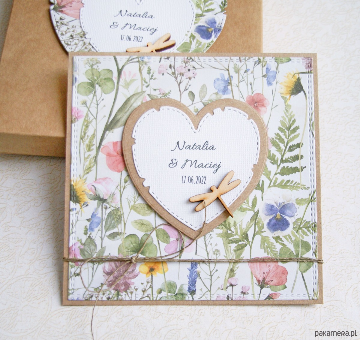kartka wykonana na bazie grubego kartonu kraft (100% makulatury), ozdobiona wzorzystym papierem z motywem łąki, przestrzennym sercem (z personalizacją) oraz drewnianą ważką. przewiązana jutowym sznurkiem.