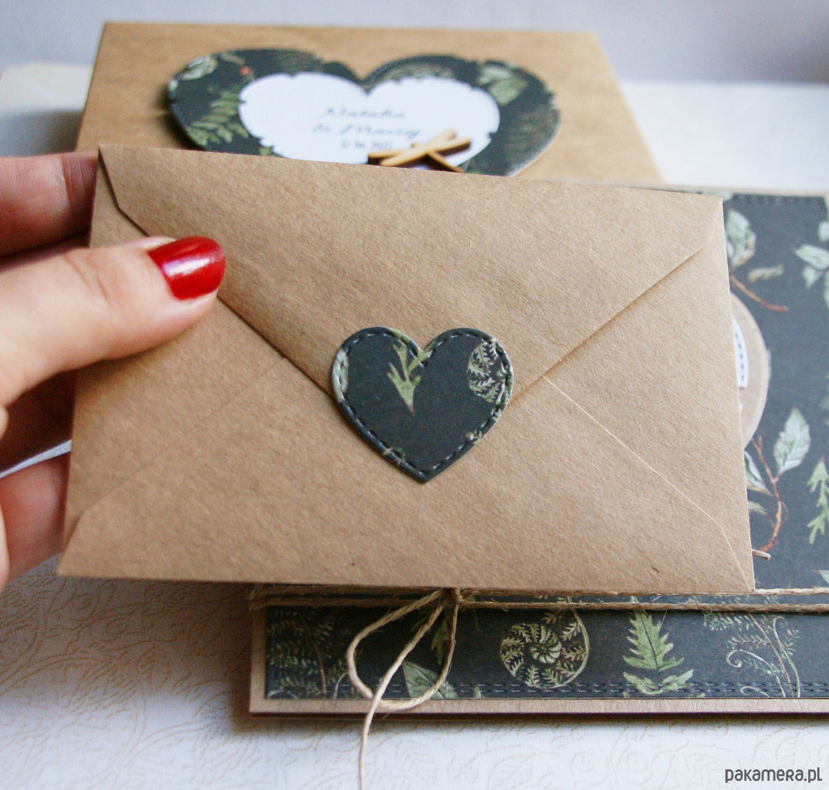 kartka wykonana na bazie grubego kartonu kraft (100% makulatury), ozdobiona wzorzystym papierem z motywem lasu, przestrzennym sercem (z personalizacją) oraz drewnianą ważką. przewiązana jutowym sznurkiem.