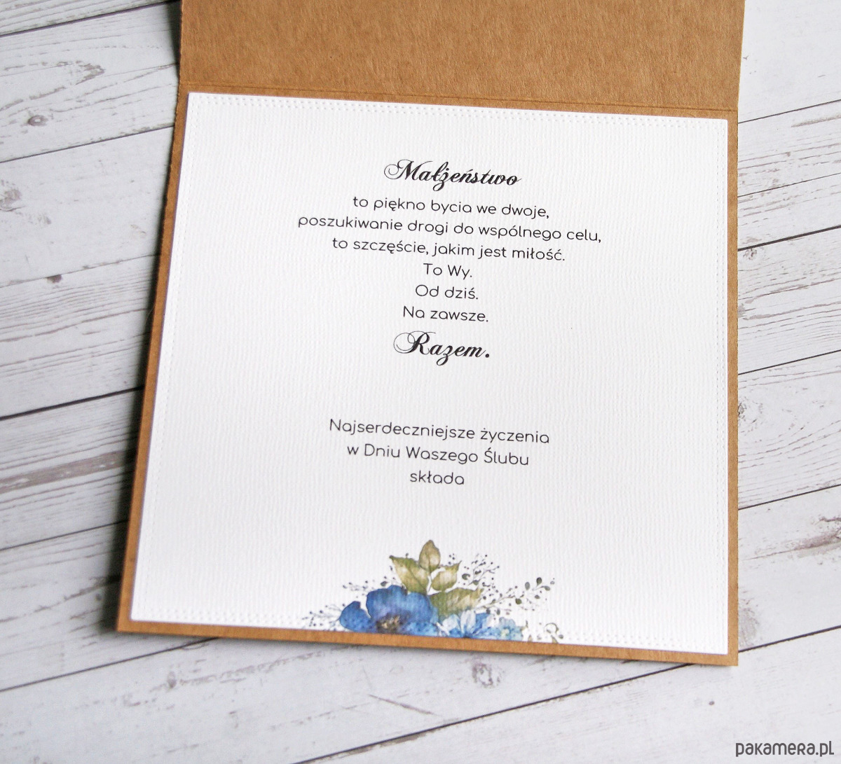 kartka wykonana na bazie grubego kartonu kraft (100% makulatury), ozdobiona papierem wizytówkowym o fakturze płótna - białym (z personalizacją) oraz motywem kwiatowym. w centrum: wysokiej jakości tekturka z beermaty. kartka przewiązana jutowym sznurkiem.
