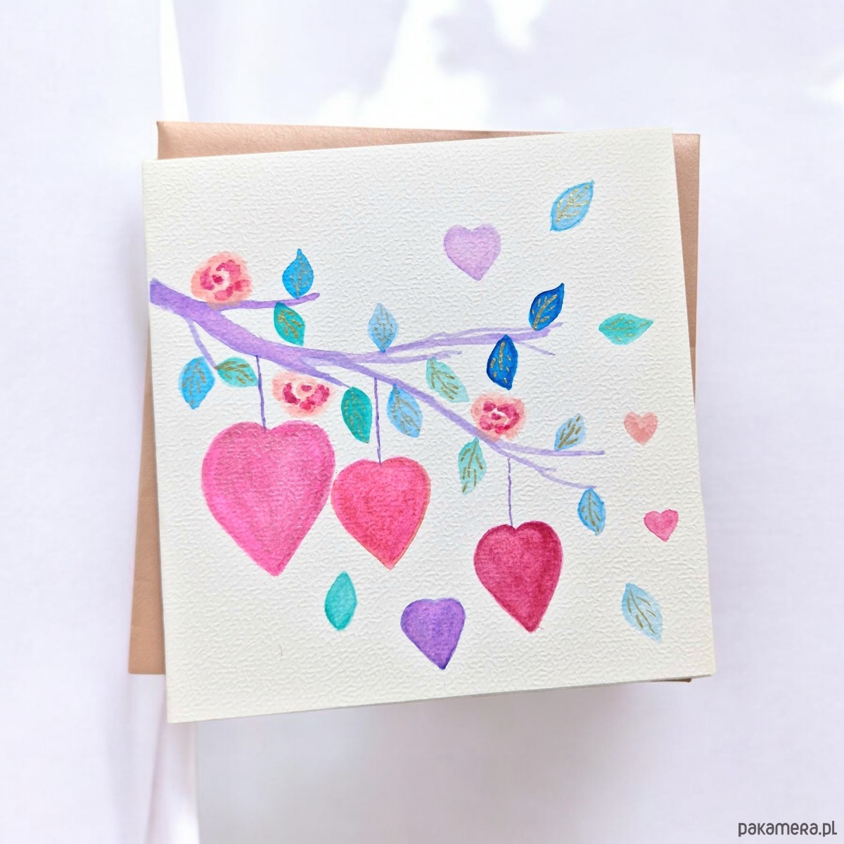 Kartka walentynkowa ręcznie malowana akwarelami w zestawie z kopertą.