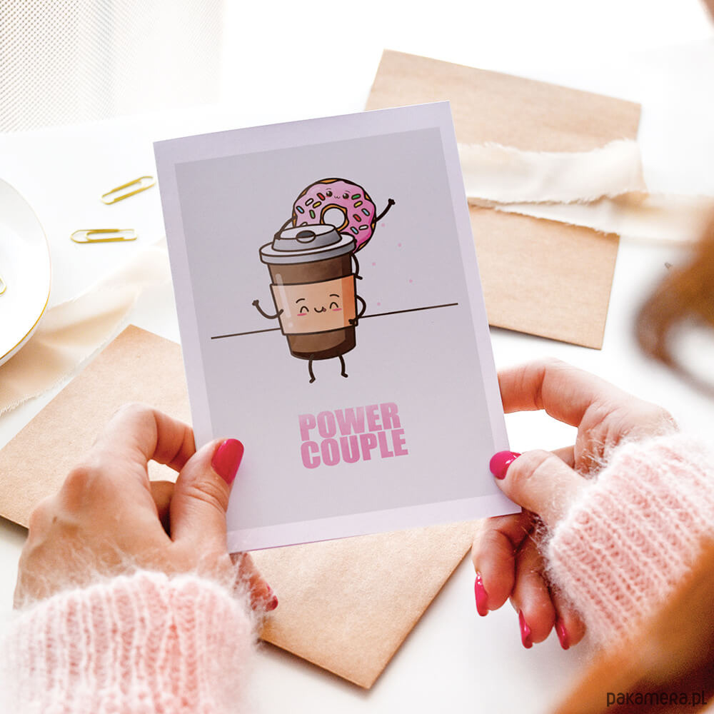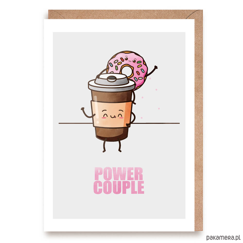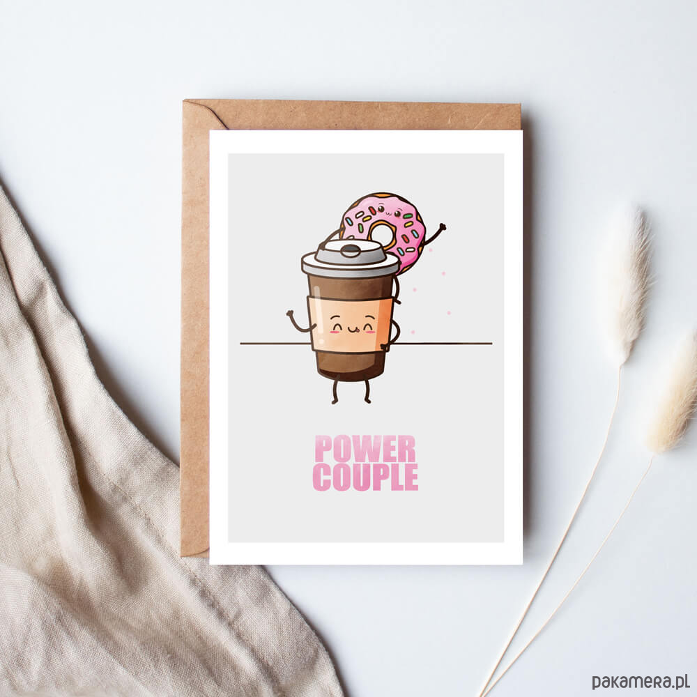 Kartka walentynkowa/miłosna kawą i donutem - Power Couple od Cardie to idealny dodatek do bukietu, prezentu albo… samodzielny gest, który mówi więcej niż tysiąc słów.
