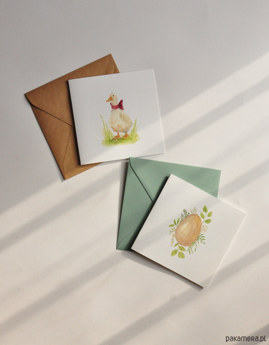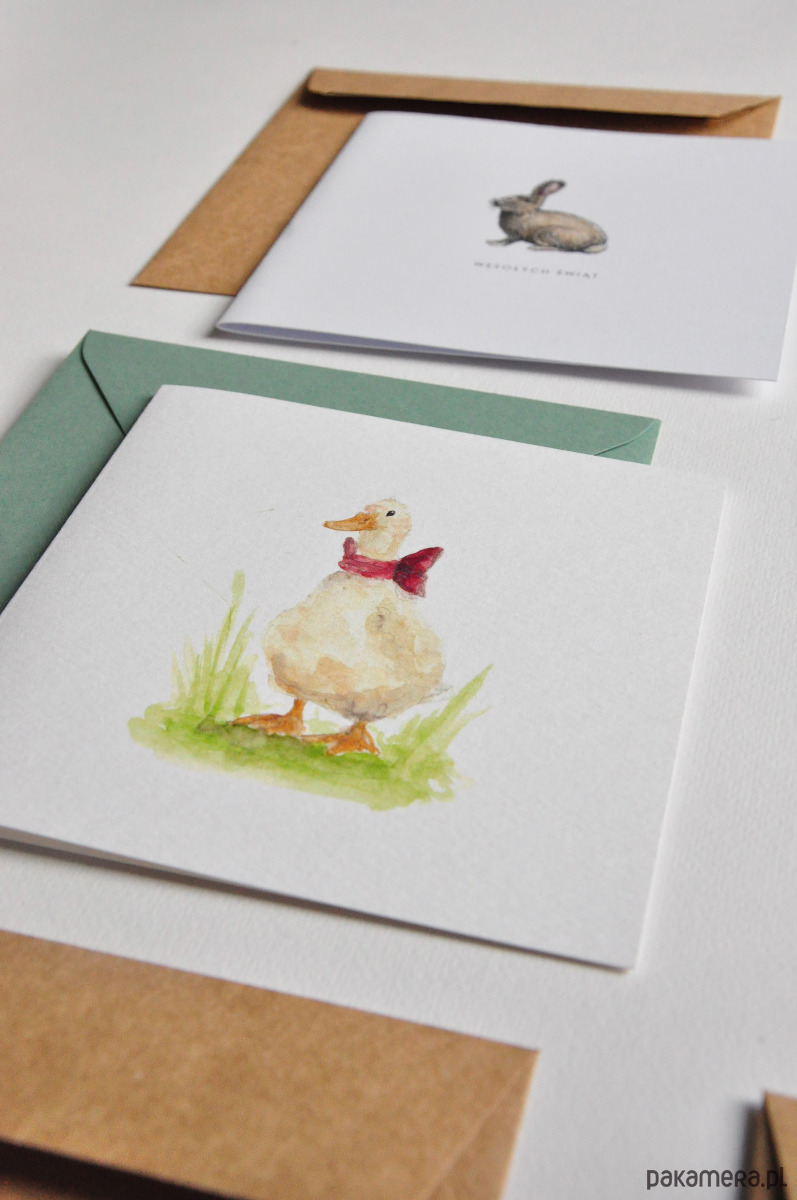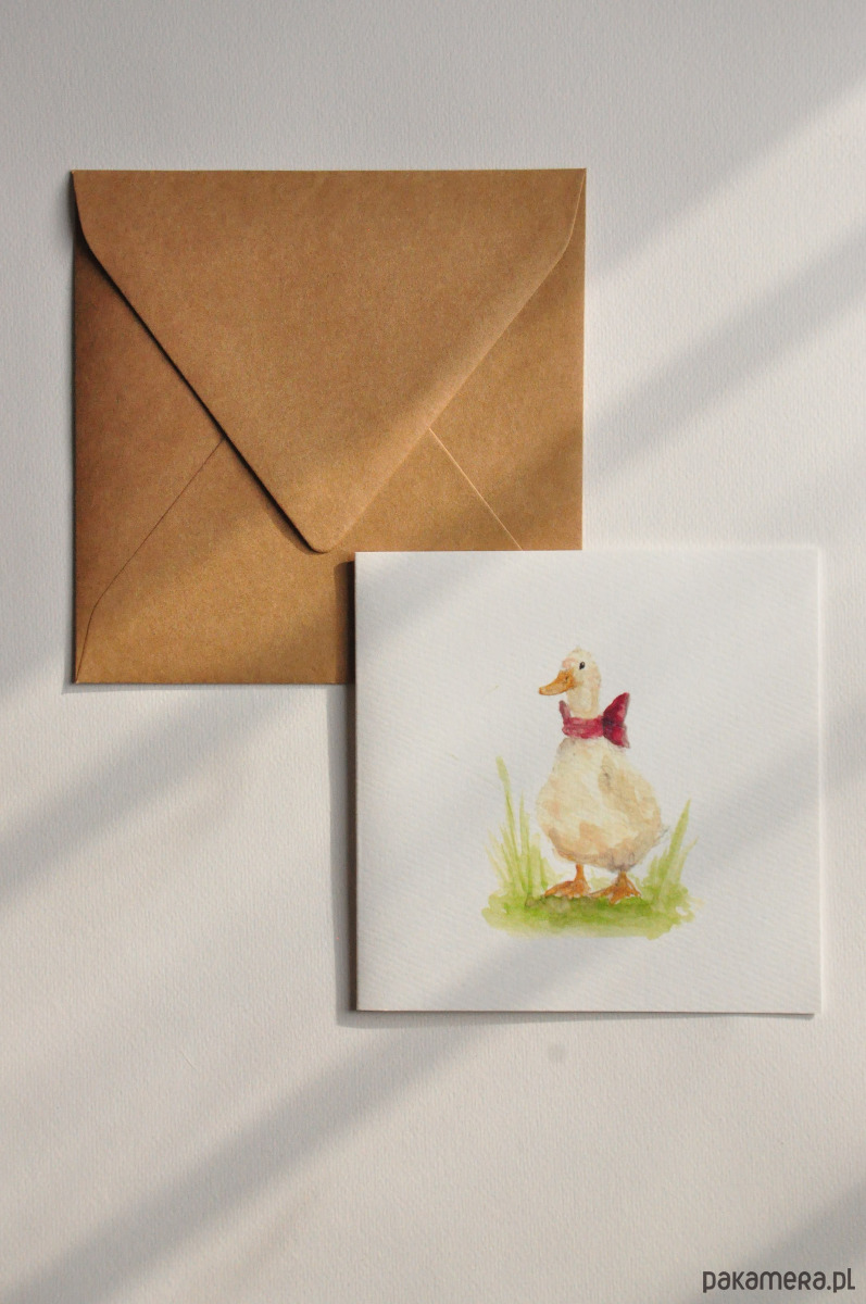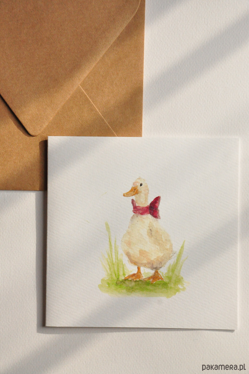 Kartka z autorską ilustracja gąski namalowanej akwarelami.