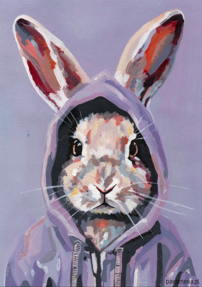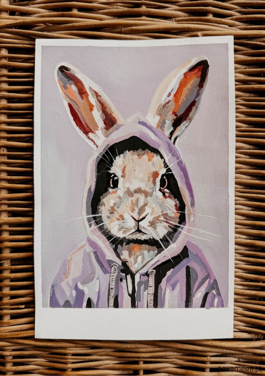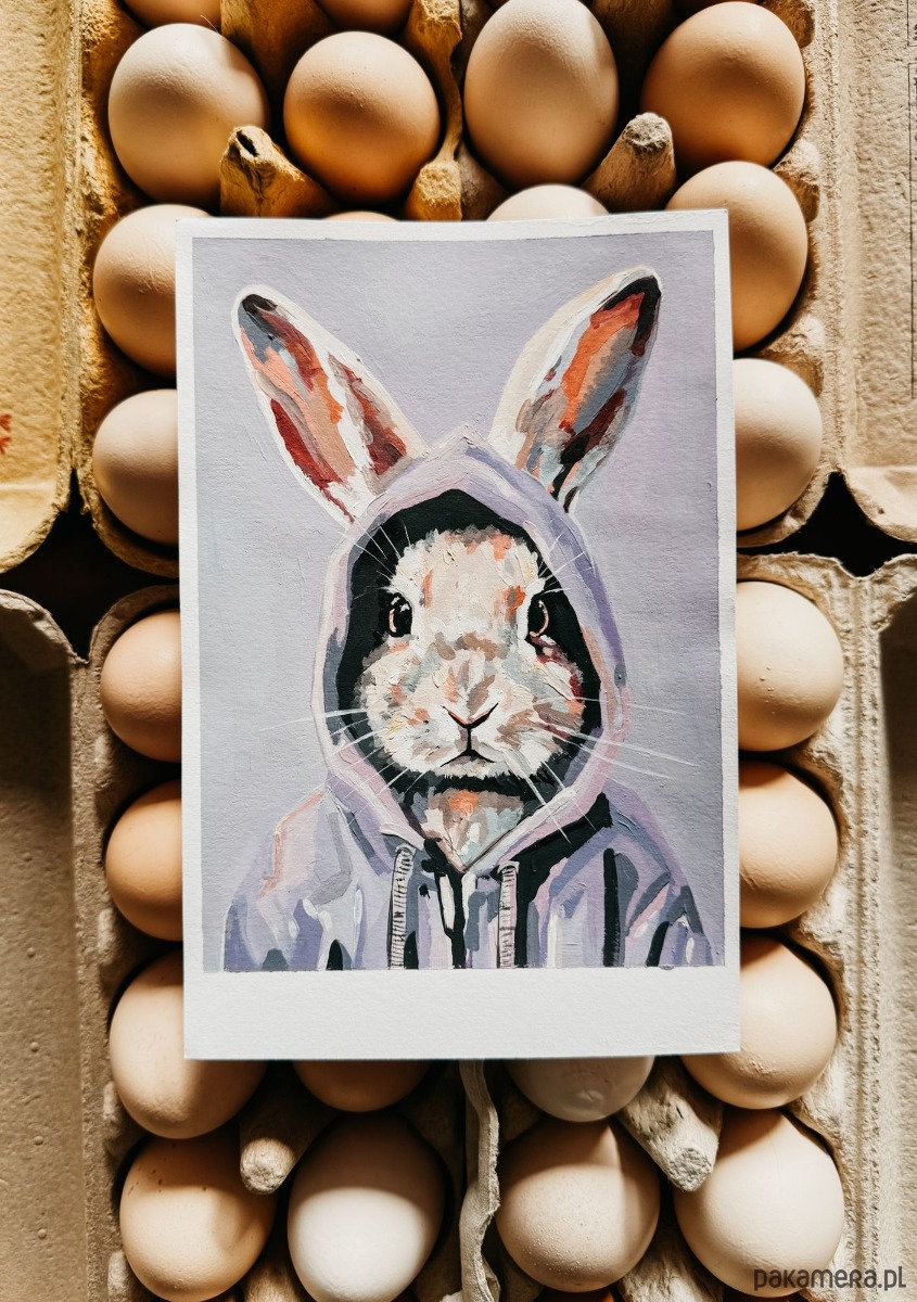 "Kic kic" przedstawia wyluzowanego króliczka. Kieszenie jego bluzy wypchane są po brzegi czekoladowymi jajkami.