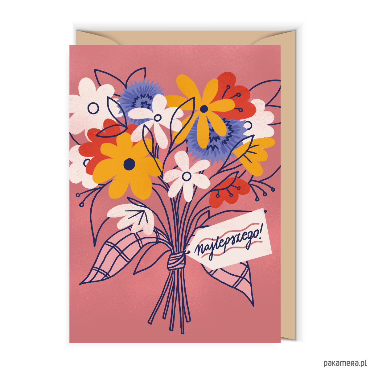Uniwersalna kartka w formacie klasycznym, z bukietem kwiatów i napisem „Najlepszego”. Projekt Justyny Frączek, papier ekologiczny o wysokiej gramaturze.Elegancka kartka okolicznościowa w klasycznym formacie, zaprojektowana przez Justynę Frączek. Utrzymana w odcieniach jasnej marsali i bordo, zdobiona bukietem kwiatów oraz prostym, a zarazem wymownym napisem „Najlepszego”. Dzięki uniwersalnemu charakterowi sprawdzi się na wiele okazji – urodziny, imieniny, jubileusze czy gratulacje. Wykonana z ekologicznego papieru o wysokiej gramaturze, łączy estetykę, trwałość i dbałość o środowisko. To stylowy dodatek do prezentu, który wyrazi szczere życzenia w pięknej formie.