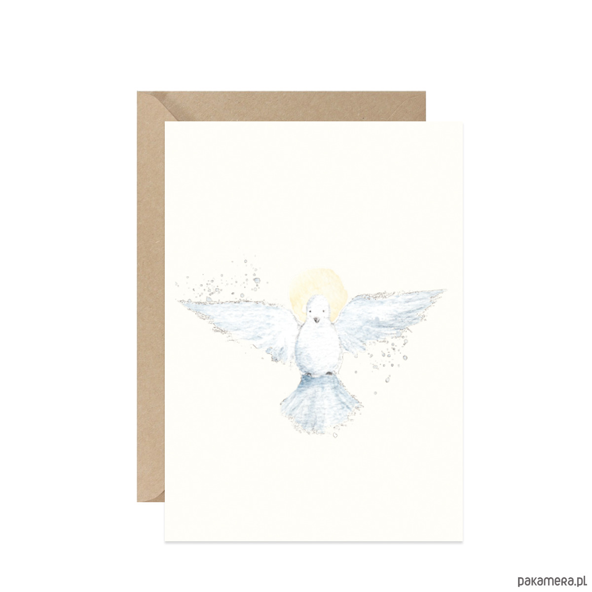 Kartka z akwarelową gołębicą symbolizującą Ducha Świętego, doskonała na życzenia z okazji Bierzmowania, Chrztu lub Pierwszej Komunii. Reprodukcja ręcznie malowanej akwareli, drukowana na papierze z recyklingu.