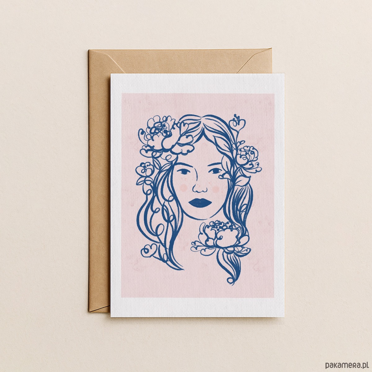 Kartka zawiera autorską ilustrację kobiety w kwiatach piwonii.
