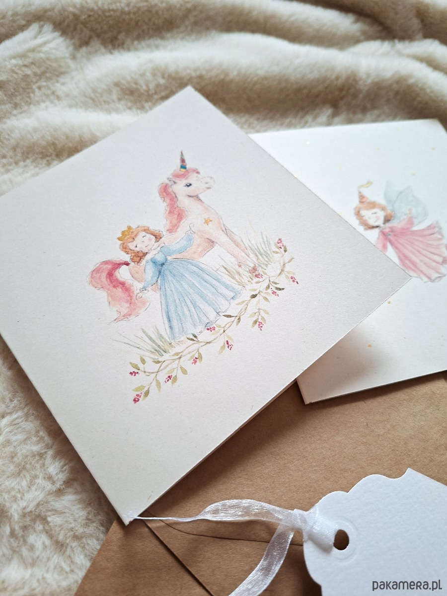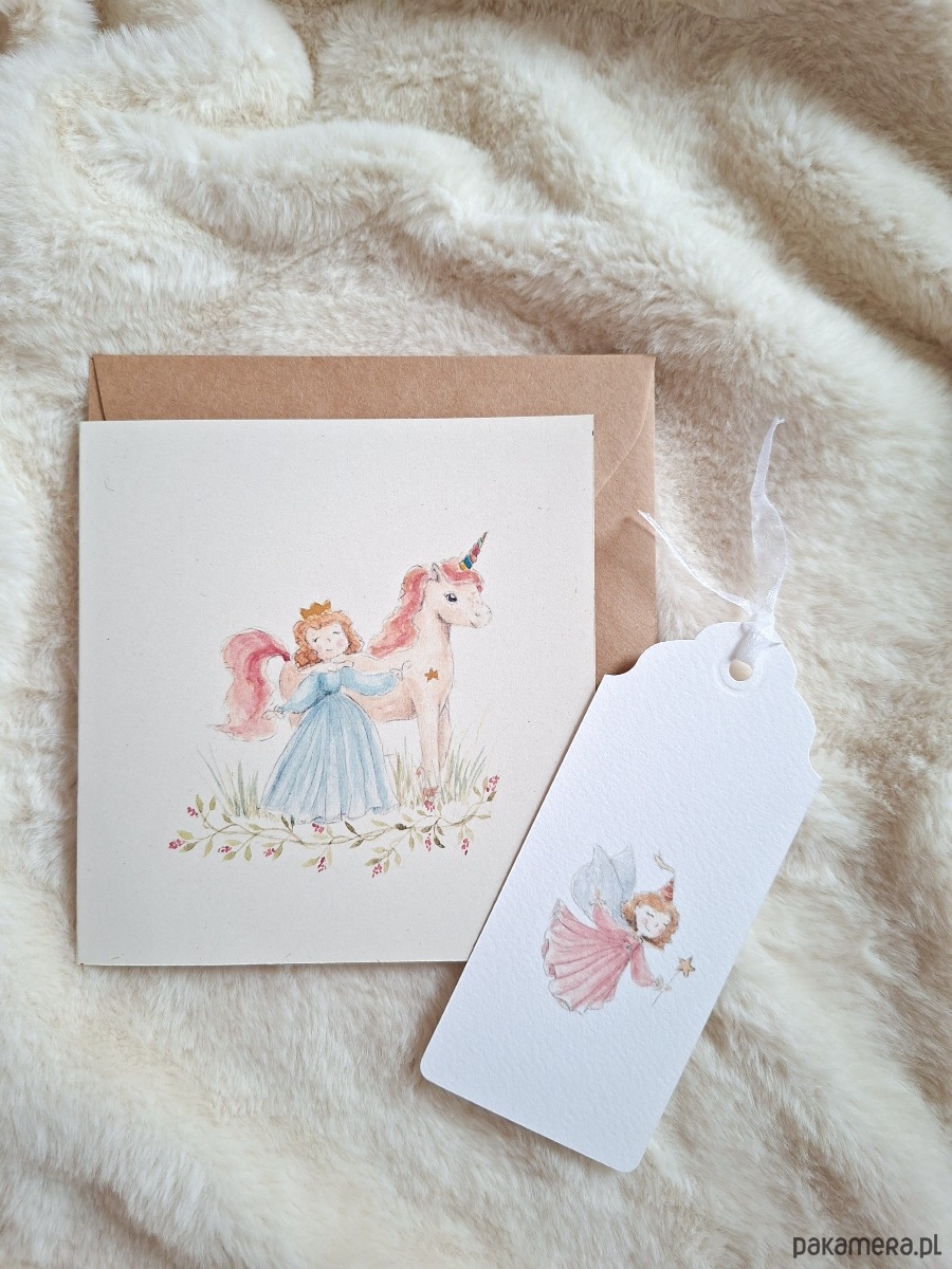 Kartka z autorską ilustracją ksieżniczki z jedndorożcem w zestawie z zakładką do książki lub bilecikiem do prezentu ;)