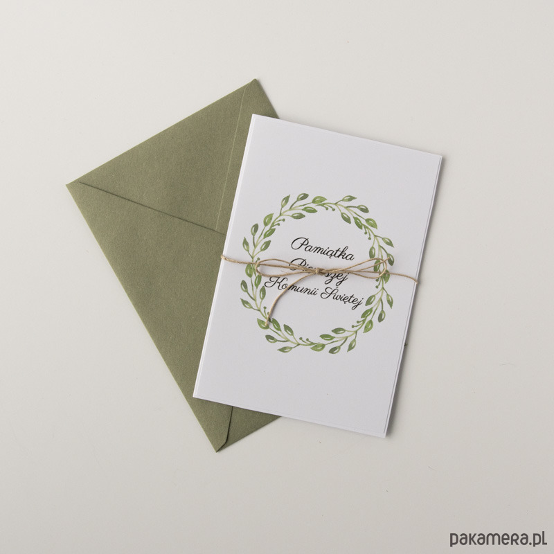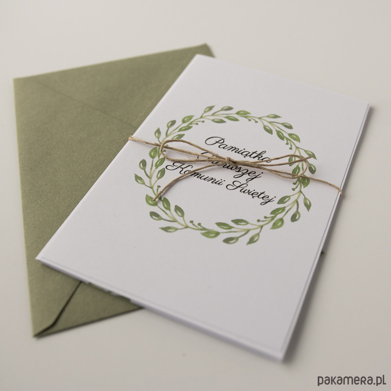 Kartka z okazji Pierwszej Komunii Świętej dziecka z motywem akwarelowego wianka, w komplecie z kopertą.