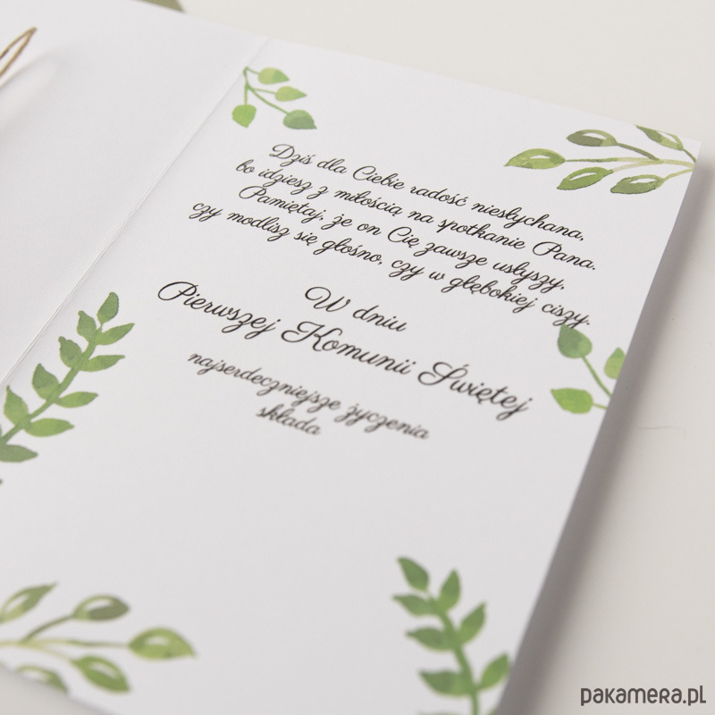 Kartka zdobiona jest wydrukiem ręcznie malowanej akwareli, w środku życzenia widoczne na zdjęciu z miejscem na odręczny podpis.