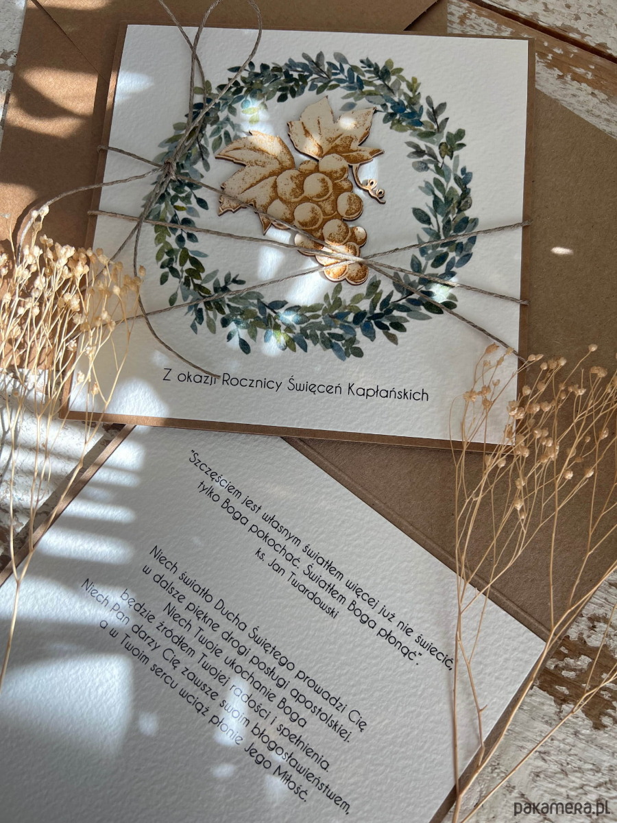 Kartka z okazji rocznicy święceń kapłańskich ręcznie robiona z życzeniami Kartka wykonana z papieru bawełnianego oraz kraftowego. Wymiary: 14x14 cm