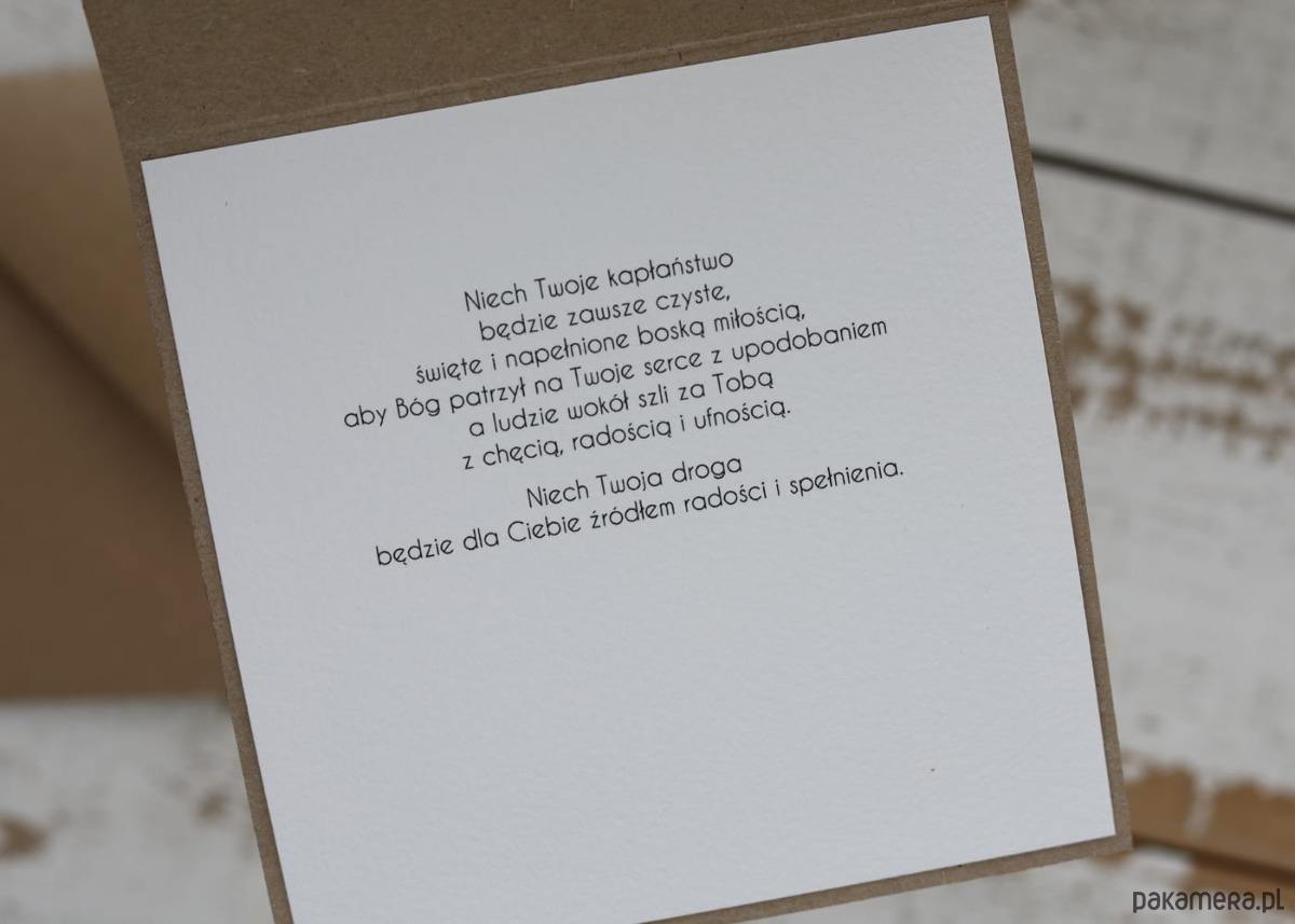 W środku wklejona jest jedna kartka z papieru bawełnianego z życzeniami widocznymi na zdjęciu. Zestaw zawiera kartkę oraz kopertę.
