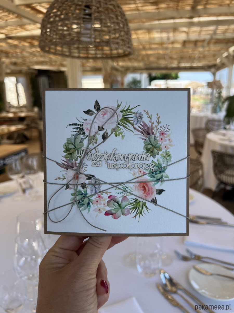 Kartka przewiązana lnianym sznureczkiem. Kartka w środku pusta, gotowa do wypisania życzeń odręcznie.